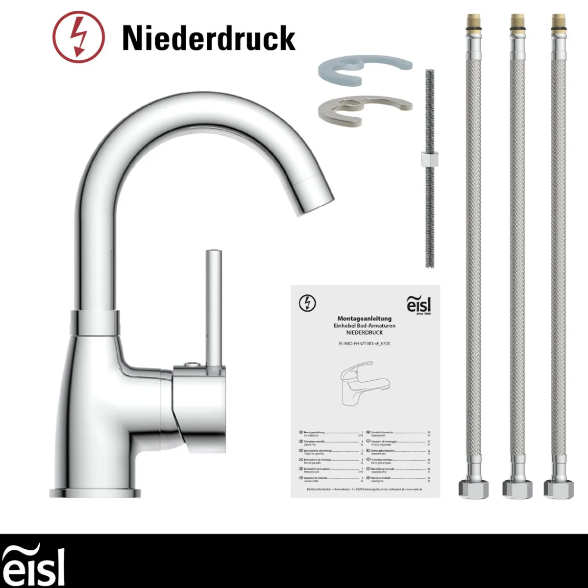 - Vollständiges Montageset mit hochwertigen, flexiblen Anschlussschläuchen an das Hauswassersystem