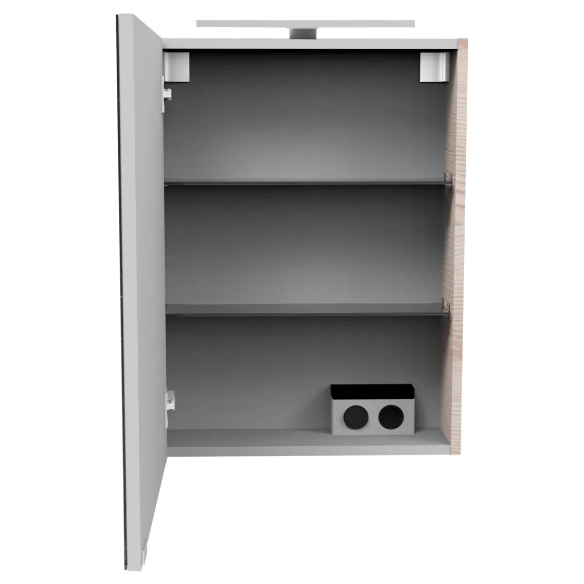 - – Ausstattung: 2 höhenverstellbare Glaseinlegeböden, Querteile + Rückwand silbergrau, Elektrobox mit Schalter und Steckdose