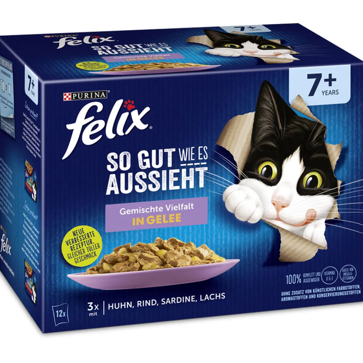 FELIX® So gut wie es aussieht® 7+ ist eine Auswahl unwiderstehlicher Mahlzeiten, die so lecker aussehen, riechen und schmecken, als hättest du sie selbst zubereitet. Jede Sorte, speziell für Katzen ab einem Alter von 7 Jahren entwickelt und hergestellt mit hochwertigen Zutaten, besteht aus zarten Stücken in Gelee für eine leckere Mahlzeit, die deine Katze lieben wird! FELIX® So gut wie es aussieht® 7+ ist in einer großen Auswahl leckerer Sorten in saftigem Gelee erhältlich, um deiner Katze jeden Tag die Abwechslung zu geben, die sie liebt! Sie schmecken wirklich so gut, wie sie aussehen! FELIX® – einfach unwiderstehlich!