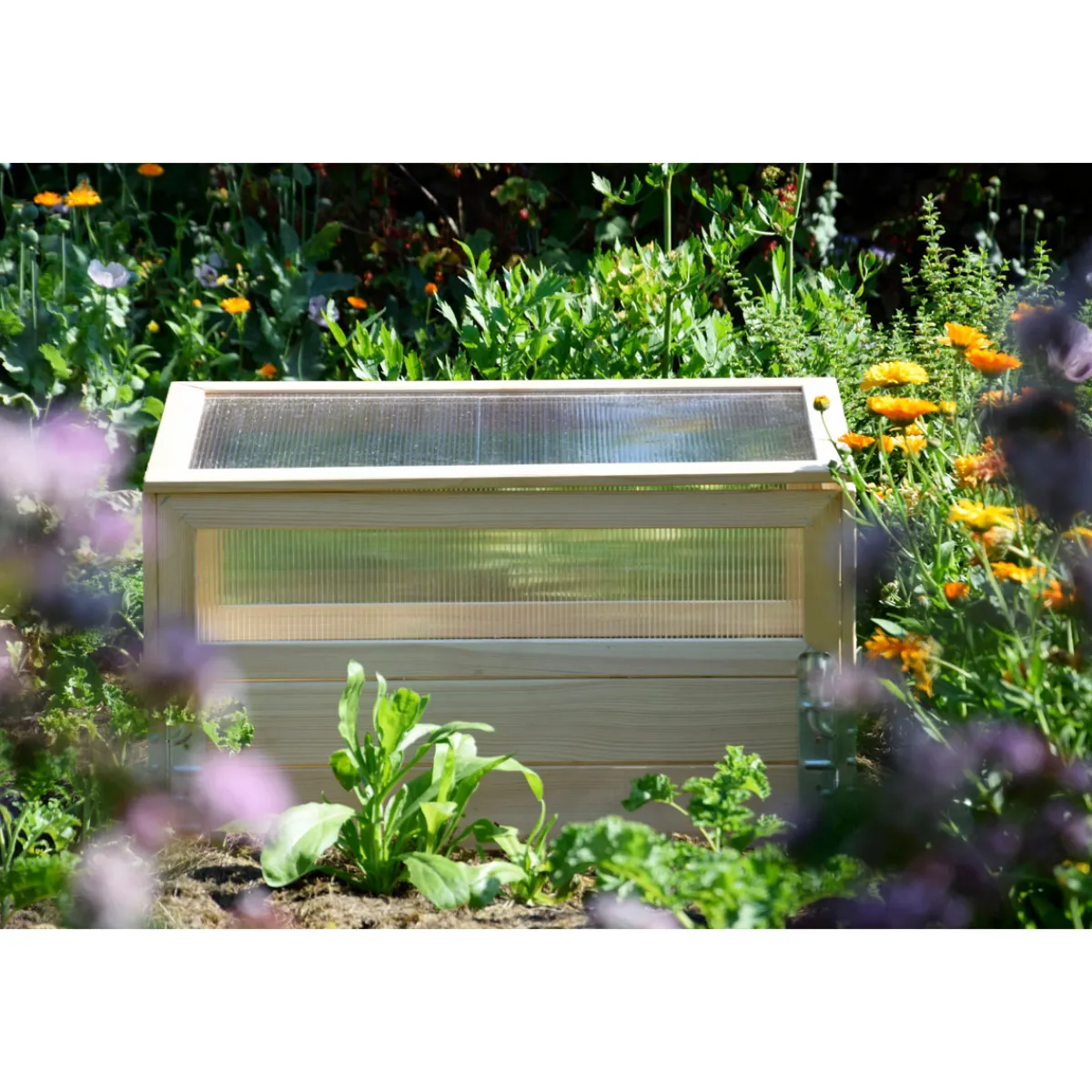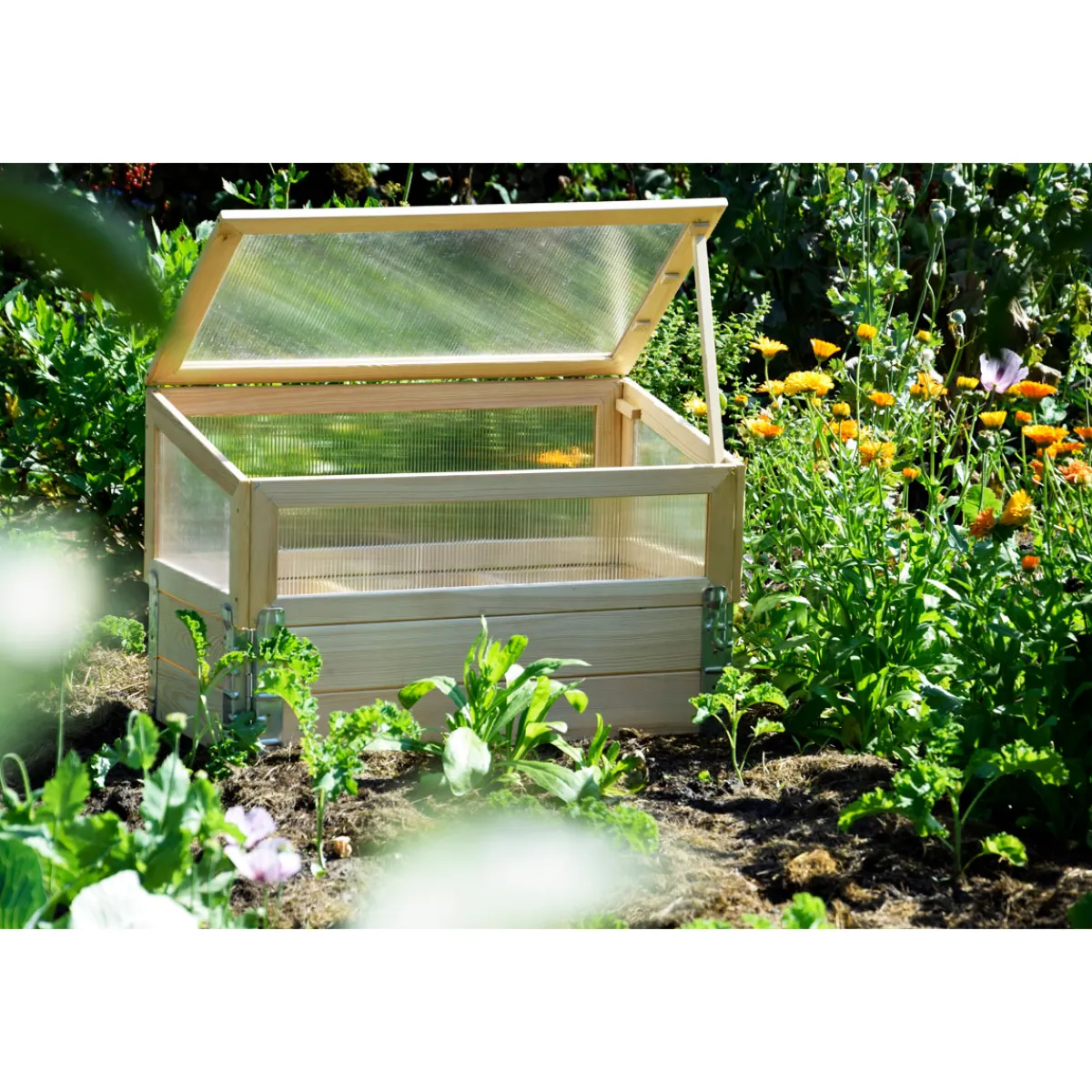 - Das Anzuchtbeet verfügt über einen stabilen Holzrahmenaufsatz für die sichere Aufzucht von empfindlichen Jungpflanzen.