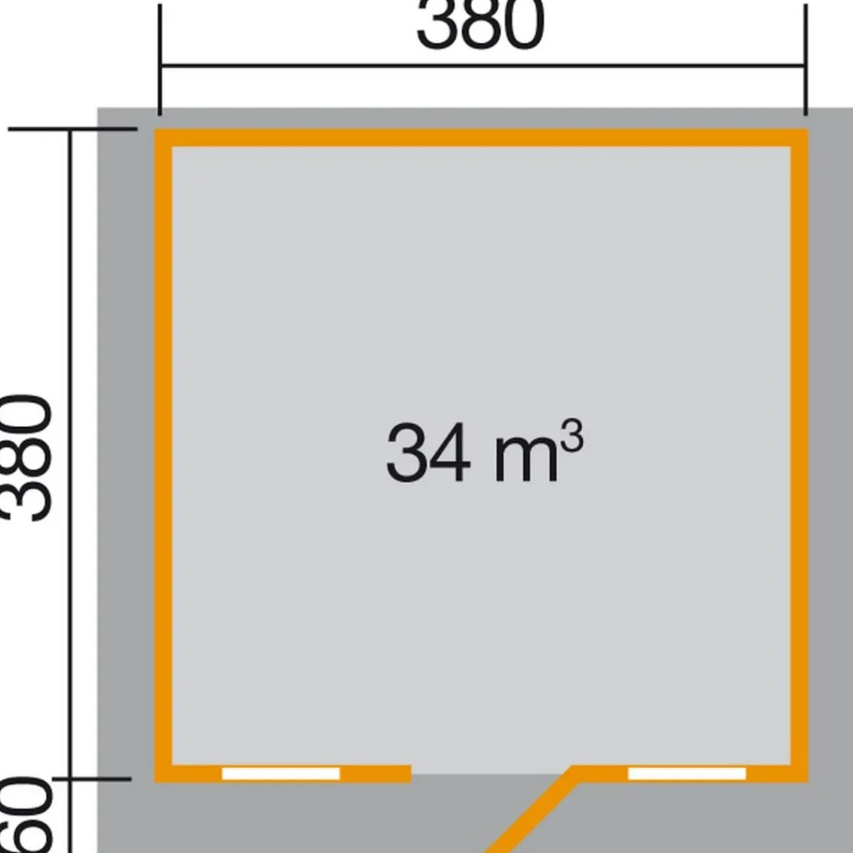 - Außenmaße (BxLxH=Trauf) (cm): 380x380x262