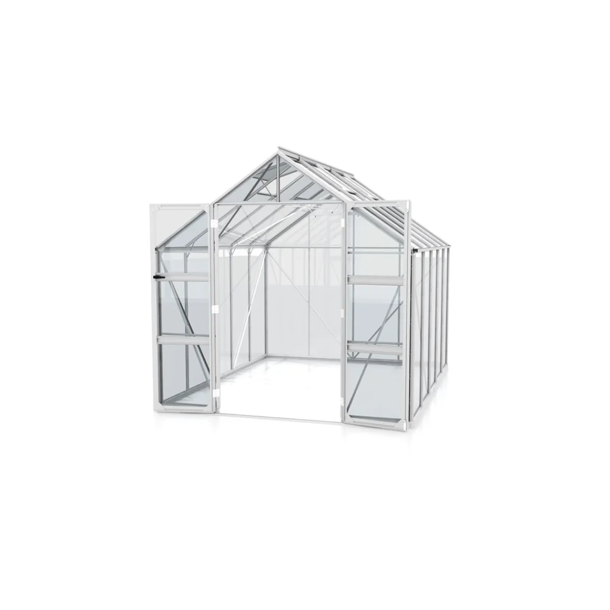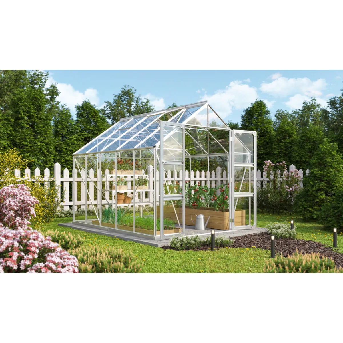 Mit dem Vitavia Gewächshaus Domus können Sie Ihre Pflanzen optimal schützen und pflegen. Das freistehende Gewächshaus bietet Ihnen eine Grundfläche von ca. 8,3 m² und ist mit einem klassischen Satteldach ausgestattet. Die Doppelschwingtüren ermöglichen einen bequemen Zugang zum Inneren des Gewächshauses.