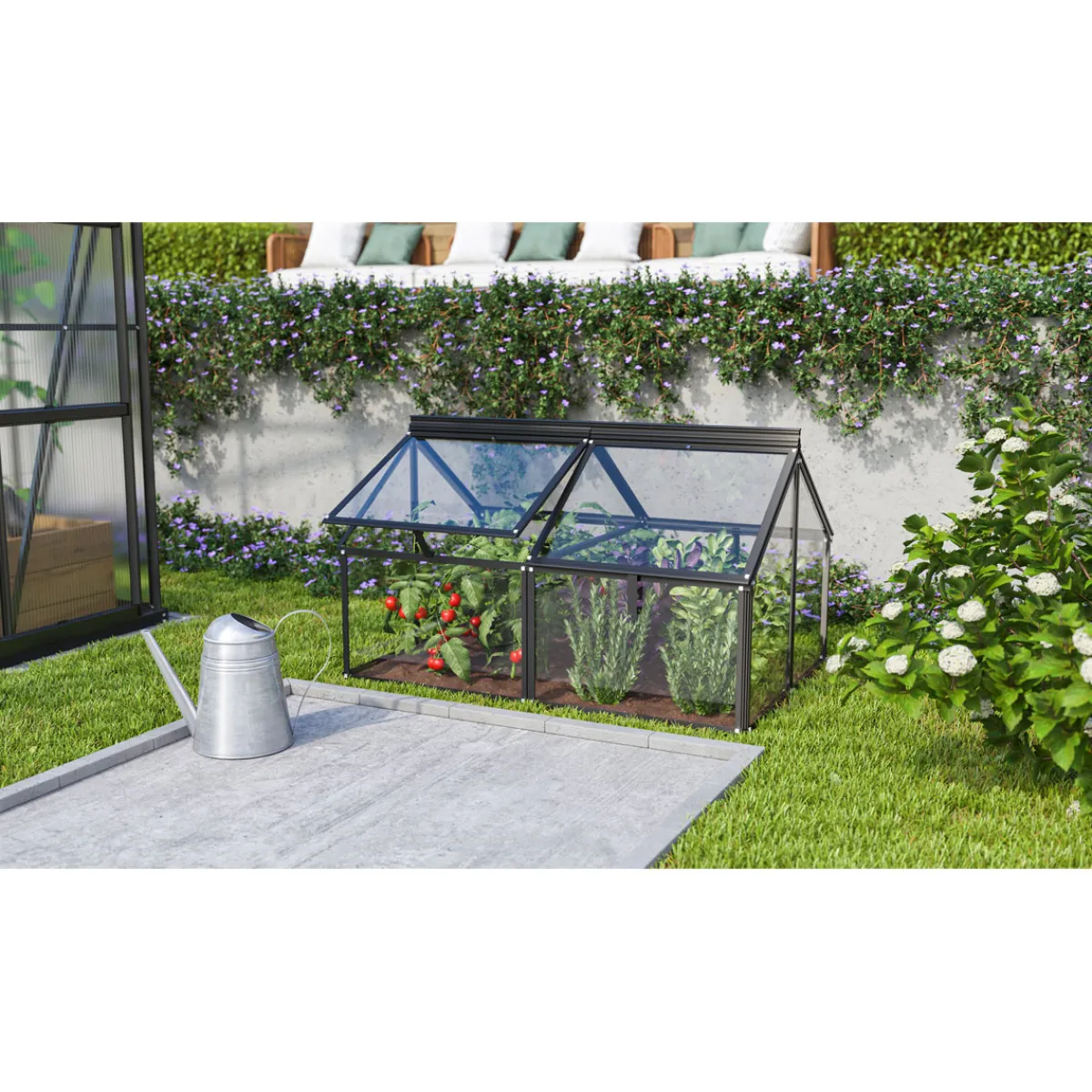 Mit diesem Frühbeet holen Sie sich eine Menge Optionen für das Hobbygärtnern in den Garten: Seine Maße erlauben den einfachen Aufsatz auf einen Palettenaufsatzrahmen, über dessen Höhe Sie frei bestimmen können. Außerdem ist es mit einer Seitenhöhe von knapp 40 cm und einer Gesamthöhe von 72 cm so hoch, dass Ihre Pflanzen weit über die Anzuchtphase hinaus darin verbleiben können. Das Dach besteht aus vier aufstellbaren Dachfenstern, sodass Sie quasi über das bestbelüftete Mini-Gewächshaus auf dem Markt verfügen. Die Glasversion des Gaja Jumbo ist dem Vitavia-Standard folgend mit kristallklarem Sicherheitsglas (ESG) ausgestattet: Das thermische vorgespannte Blankglas, mit dem auch die Vitavia Gewächshäuser verglast sind, zeichnet sich durch höhere Stabilität und Schlagfestigkeit aus. Sollte doch mal eine Scheibe zubruch gehen, splittert sie nicht scharfkantig, sodass Kinder und Haustiere keine Verletzungen davontragen. Mit besseren Isoliereigenschaften punktet die alternative Variante mit Hohlkammerplatten-Eindeckung. So verlängern ambitionierte Hobbygärtner ihre Saison um weitere Wochen.Das Gaia Jumbo kommt als Bausatz und ist in zwei Profilfarben erhältlich: Aluminium eloxiert und Schwarz pulverbeschichtet.