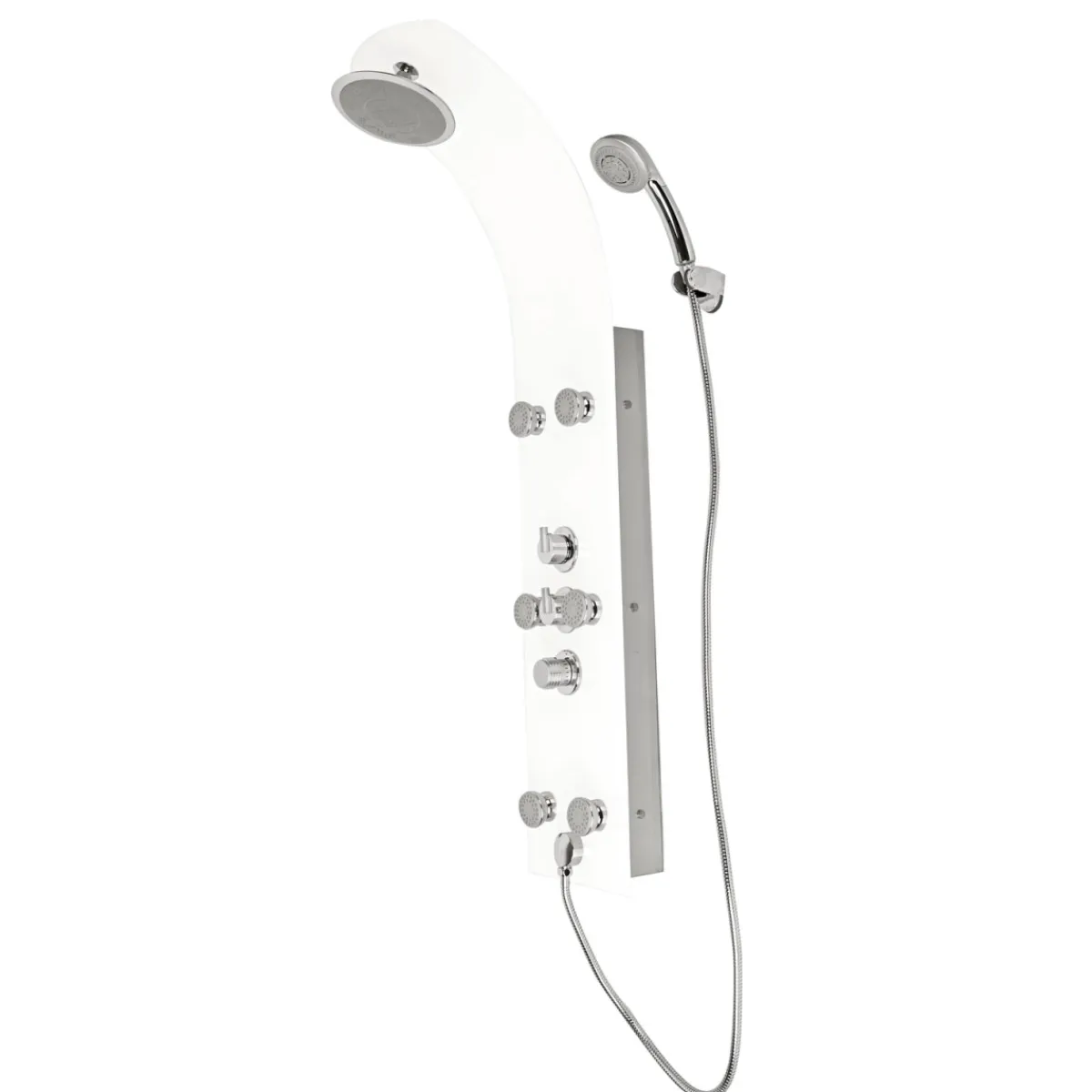 Das Glas-Duschpaneel weiß von SCHÜTTE bietet Ihnen ein luxuriöses Duscherlebnis direkt in Ihrem eigenen Badezimmer. Mit insgesamt sechs verschiedenen Strahlarten inklusive Massagedüsen können Sie Ihre eigene Wellness-Oase schaffen und den Alltag hinter sich lassen. Die hochwertigen Materialien sorgen dafür, dass Sie lange Freude an diesem Produkt haben werden.
