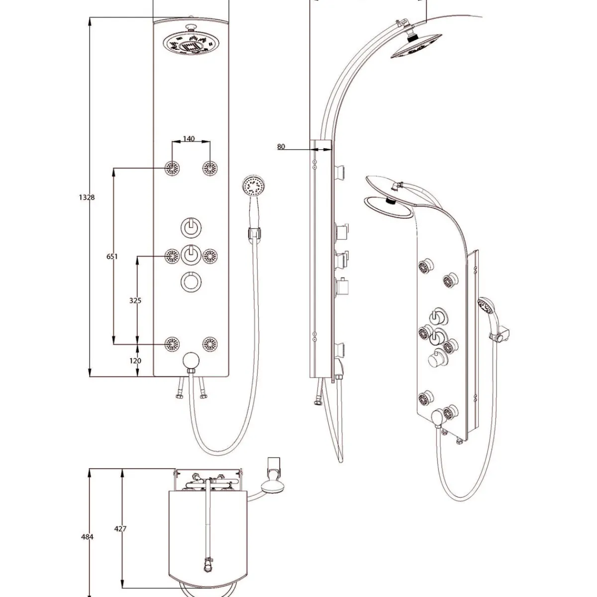 - Ausstattung: Thermostat, Kopfbrause, Handbrause, Massagedüsen