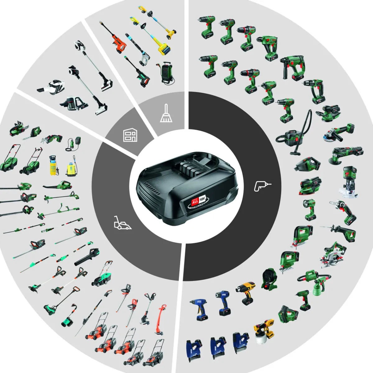 Mit dem Akku Starter Set 18V erhalten Sie eine zuverlässige Energieversorgung für Ihre P4All Geräte. Der leistungsstarke Li-Ionen-Akku mit einer Kapazität von 2,5 Ah und einer Spannung von 18 V ist in nur ca. 79 Minuten vollständig aufgeladen und bietet Ihnen somit genügend Power für Ihre Arbeiten. Der enthaltene Akku und das Ladegerät sind mit allen Produkten des grünen Bosch Home & Garden 18 Volt Systems und Bosch Unlimited Staubsaugern kompatibel