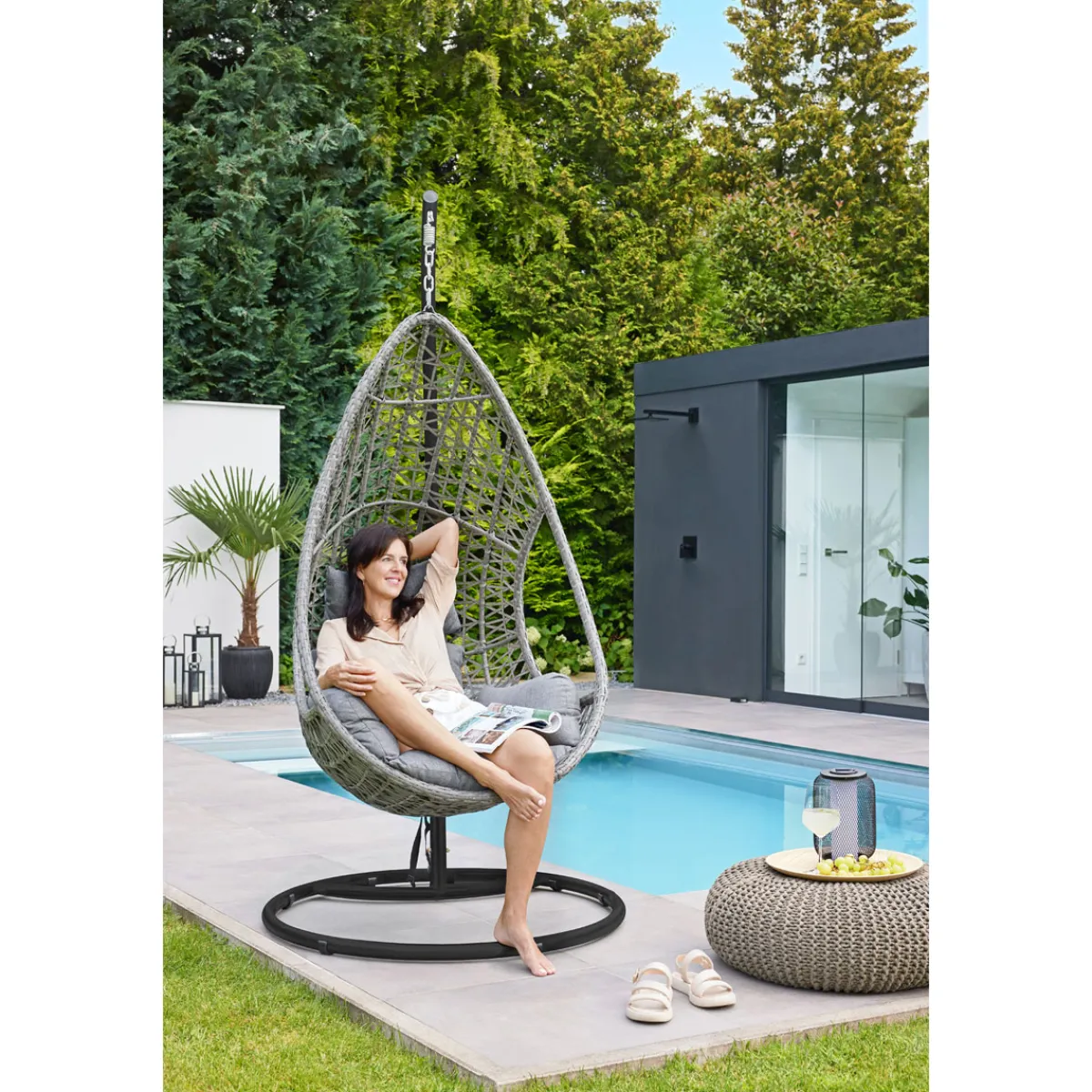 - – Extras: HxØ 208×103 cm, Hängesessel BxHxT 89x140x79 cm, Sitz- und Kopfkissen aus Strukturpolyester grau