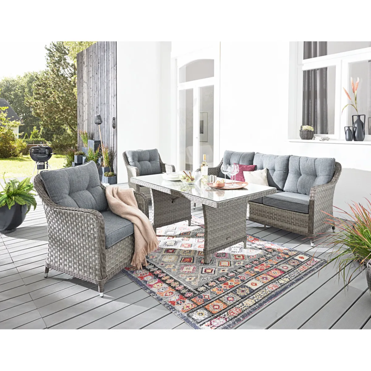 - Grau als Grundfarbe harmoniert wunderbar mit verschiedenen Einrichtungsstilen im Outdoor-Bereich