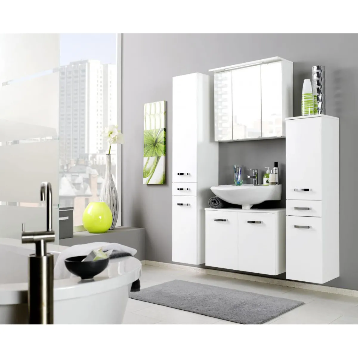 Front: MDF in Weiß HochglanzKorpus: Spanplatte in WeißMetallgriff verchromt