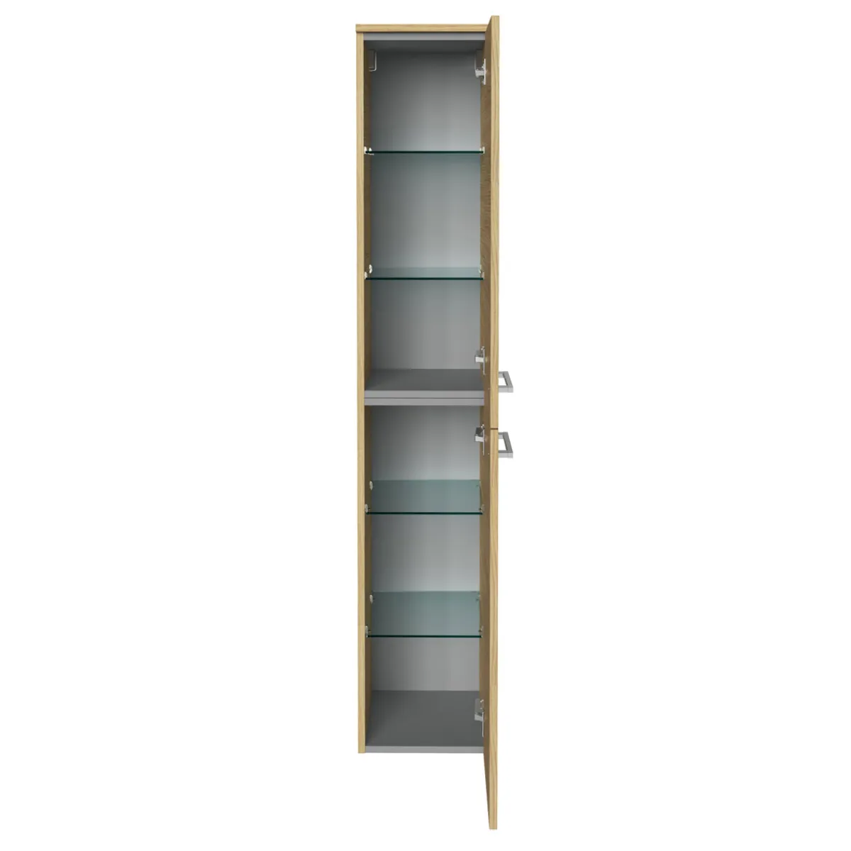 - – Ausstattung: 2 Türen Anschlag rechts, 4 Glaseinlegeböden, Querteile + Rückwand silbergrau, Korpus aus 2 Teilen