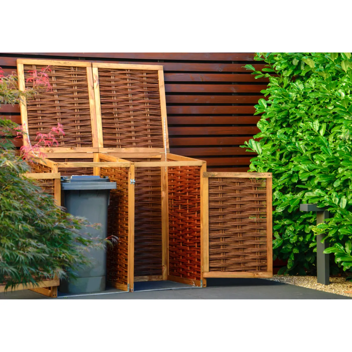 Verabschieden Sie sich von unschönen Mülltonnen, die Ihr Gartenbild stören! Mit der dobar Holz-Mülltonnenbox in edlem Braun holen Sie sich nicht nur eine praktische Lösung, sondern auch ein stilvolles Design-Highlight in Ihren Außenbereich. Diese Mülltonnen-Verkleidung überzeugt durch ihr robustes Material aus hochwertigem Kiefernholz und das dekorative ungeschälte Weidengeflecht. Ob Sonne oder Regen – diese Box bleibt wetterfest und langlebig. Und das Beste? Dank des praktischen Klappdachs können Sie Ihre Mülltonne jederzeit mühelos öffnen, während eine clevere Kette verhindert, dass das Dach nach hinten umschlägt.