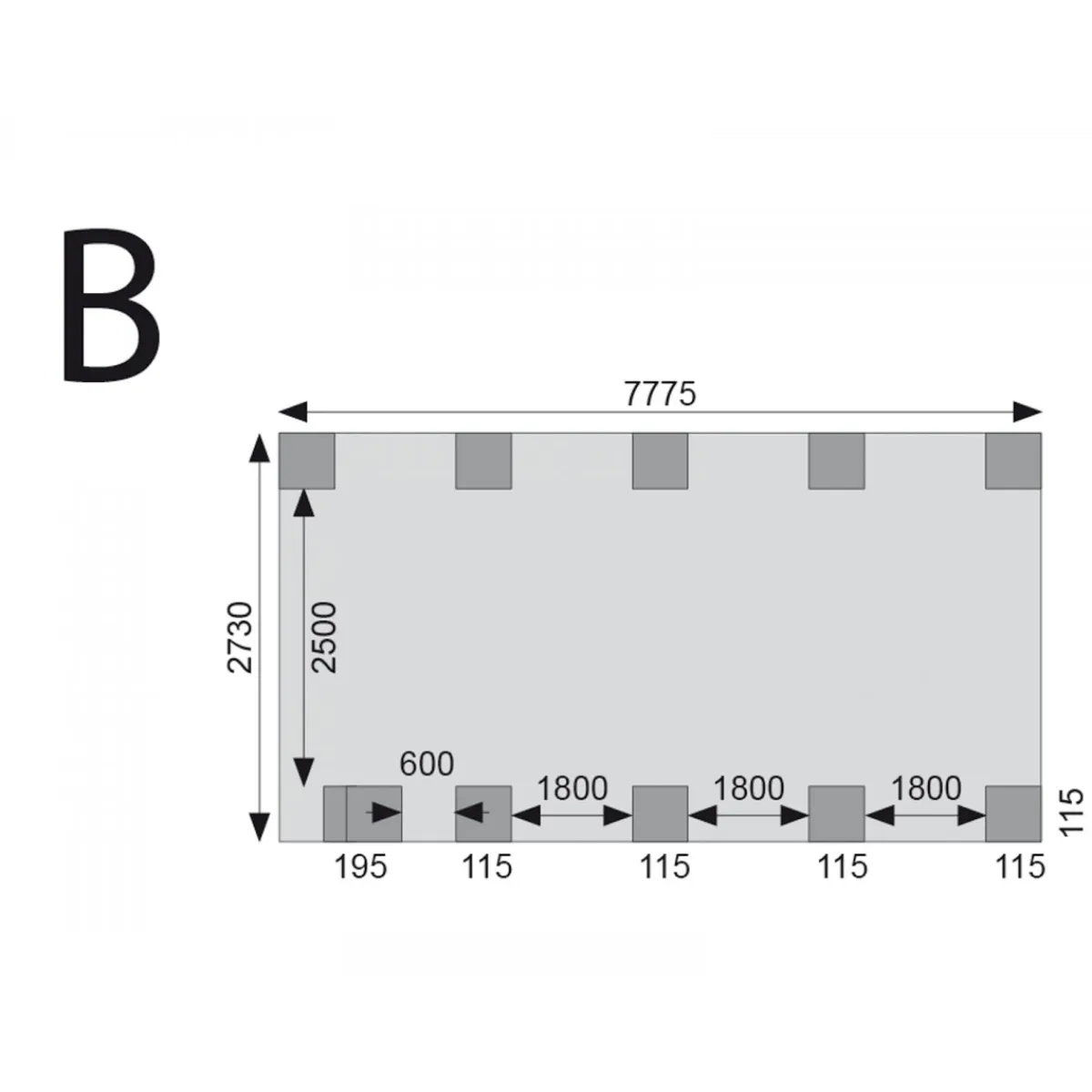 Der Karibu Einzelcarport „Classic 3“ inklusive einem Einfahrtsbogen schützt das Auto sicher und zuverlässig vor Regen, Schnee oder Hagel.Der Einzelcarport „Classic 3“ besteht aus zehn 11,5×11,5 mm starken Pfosten, die aus kesseldruckimprägniertem Massivholz gefertigt wurden und zusammen mit der Dachplatte eine stabile Konstruktion bilden. Der Carport hat ein Gewicht von 732 kg und hält einer maximalen Schneelast von 75 kg/m² stand. Der Unterstellplatz ist mit einer Dacheindeckung aus grauen, 0,8 mm starken PVC-Trapezplatten ausgestattet und verfügt über gerade Kopfbänder. Eine Walmdachblende aus 19 mm Glattkantbrettern, sämtliche benötigten Beschläge und eine detaillierte Montageanleitung gehören ebenfalls zum Lieferumfang. Der Einzelcarport verfügt über ein Außenmaß von 274×780 cm, einem umbauten Raum von 63,4 m³ und einer Firsthöhe von 234 cm. Das Innenmaß beträgt 250×756 cm und bietet so eine Einfahrtsbreite von 250 cm und eine Einfahrtshöhe von 206 cm. Der Dachüberstand beträgt hinten 5 cm, seitlich jeweils 22 cm und vorne 80 cm.Der Karibu Einzelcarport „Classic 3“ Variante B inklusive einem Einfahrtsbogen ist ein hochwertiger Unterstand, der das Auto sicher vor Witterungseinflüssen schützt.