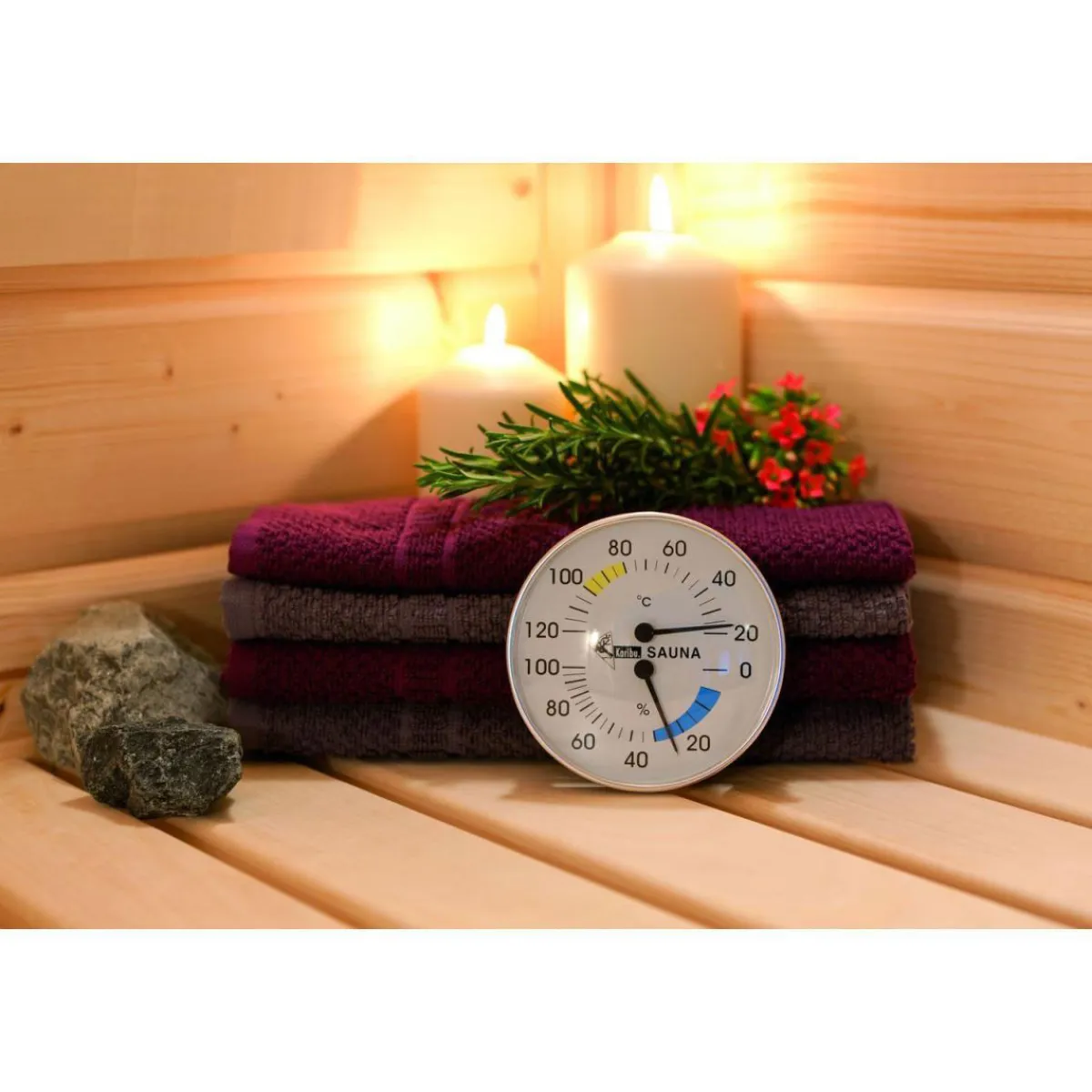 Wer seine Sauna optimal nutzen möchte, sollte unbedingt auf das richtige Raumklima achten. Der hochwertige Metall-Karibu Kilmamesser Classic unterstützt Sie dabei zuverlässig. Mit seinem präzisen Thermometer und Hygrometer sorgt er für eine angenehme Atmosphäre in Ihrer Sauna – so können Sie sich vollkommen entspannen.
