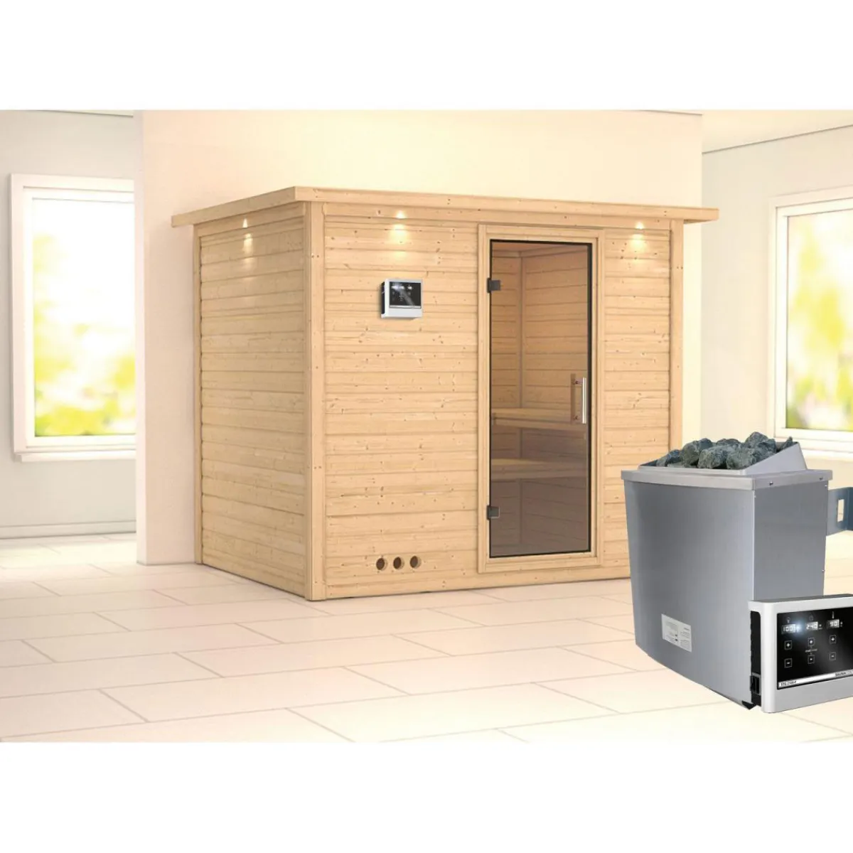 Karibu Sauna Sonara Fronteinstieg 9 kW Ofen externe Strg mit Kranz Klarglas-Tür