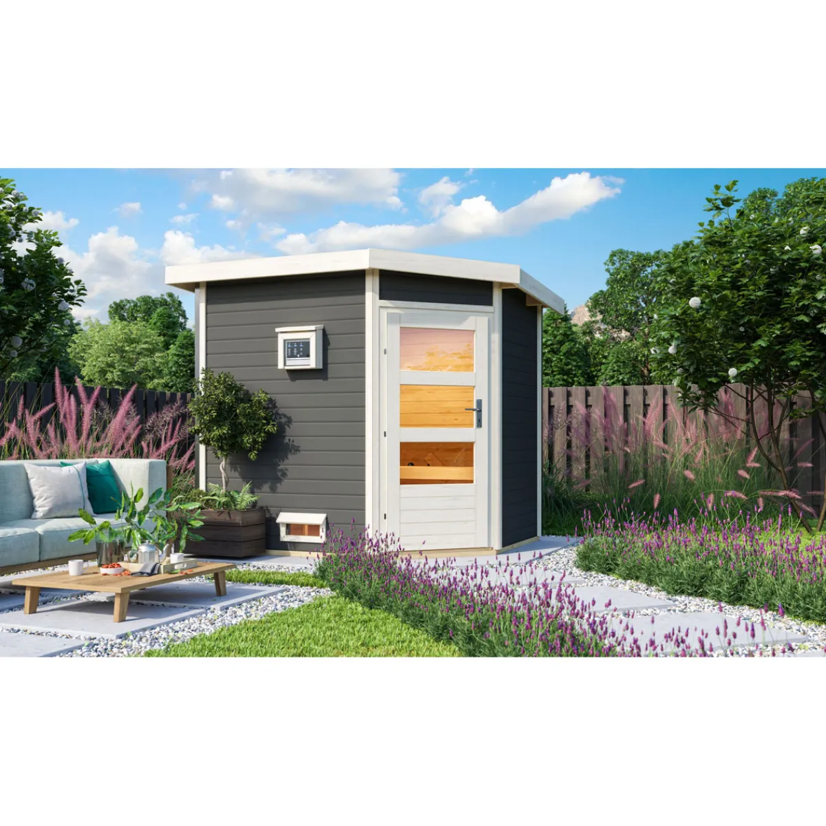 Karibu Saunahaus- Set „Mikka“ terragrau mit Ofen 9 kW ext. Steuerung