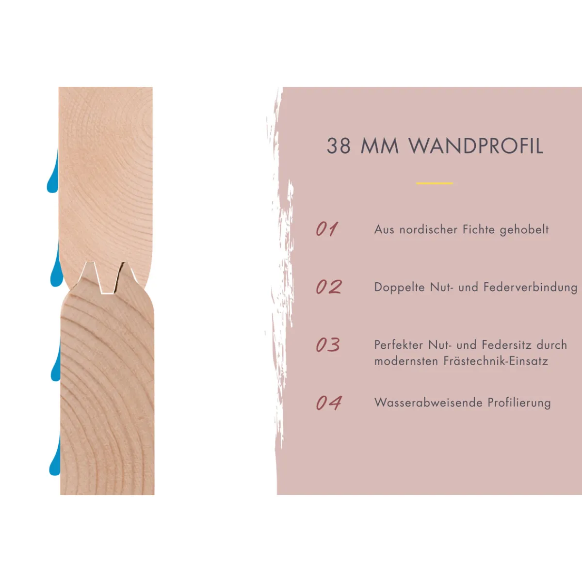 Das Saunahaus aus besten 38 mm starken Wandbrettern aus nordischer Fichte wird im Steck-/Schraubsystem montiert. Mit einem Gesamtmaß von 231 cm x 196 cm bietet es genügend Platz für ungestörte Wellnessstunden im eigenen Garten. Der Saunaraum ist mit einer Fläche von 219 cm x 184 cm natürlich ebenfalls ausreichend dimensioniert. Innen bieten 3 Saunabänke Platz zur Entspannung. Das formschöne und praktische Dach sorgt für den Witterungsschutz von oben. Für den nötigen Abstand zum Erdreich sorgen kesseldruckimprägnierte Bodenbalken. Auf diese werden die Wandbretter und die Nut- und Federbretter des Fußbodens montiert. Ein Ofenschutzgitter und alle notwendigen Schrauben und Beschläge sowie eine aussagekräftige Montageanleitung sind selbstverständlich ebenfalls dabei.