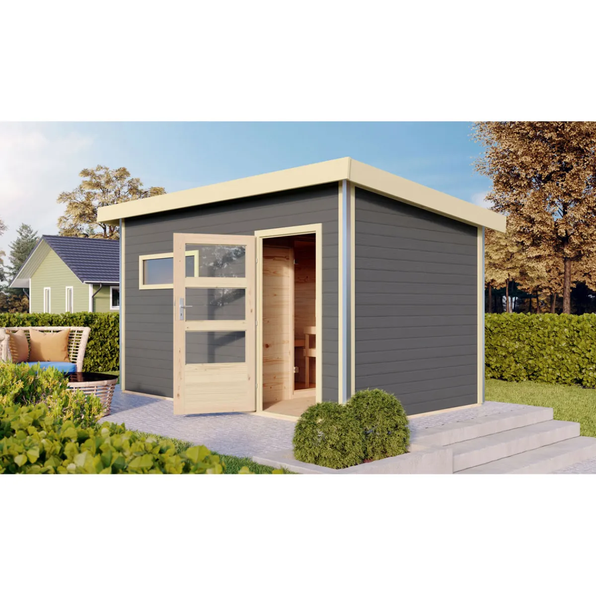 - – Lieferumfang: Saunahaus, Produktinformationsblatt, Aufbauanleitung, 9kW Ofen mit Steuerung Easy Finnisch
