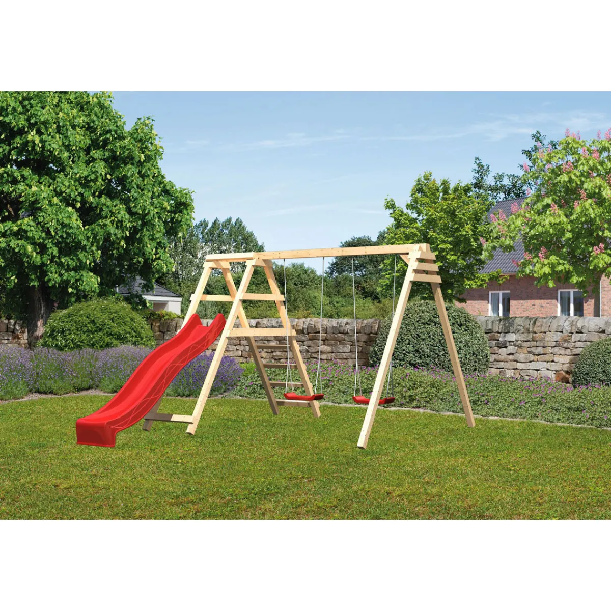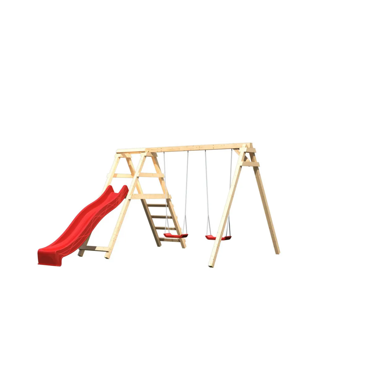 Mit dem Karibu Schaukelset mit Klettergerüst in naturbelassener Optik und roter Rutsche wird der Garten zum Spielplatz. Das Set bietet zahlreiche Möglichkeiten zum Schaukeln, Klettern und Rutschen und ist für Kinder von 3 bis 14 Jahren geeignet.