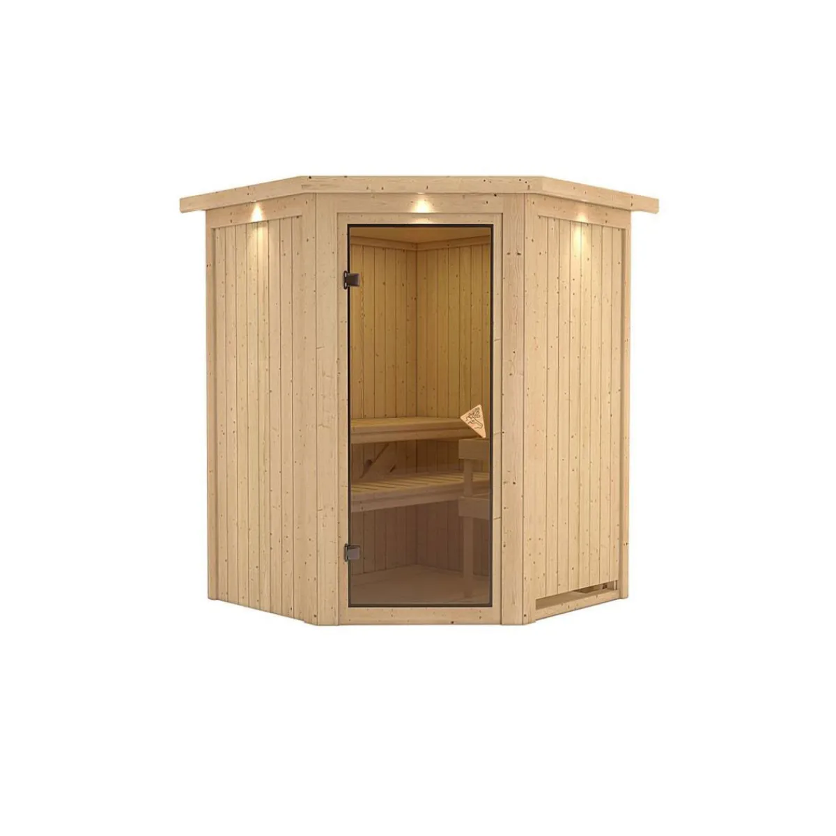 Erleben Sie pure Entspannung in der Karibu Systemsauna Larin. Mit nordischer Fichte und einem Dachkranz mit Halogenstrahlerset wird die Sauna zum Highlight in Ihrem Garten.