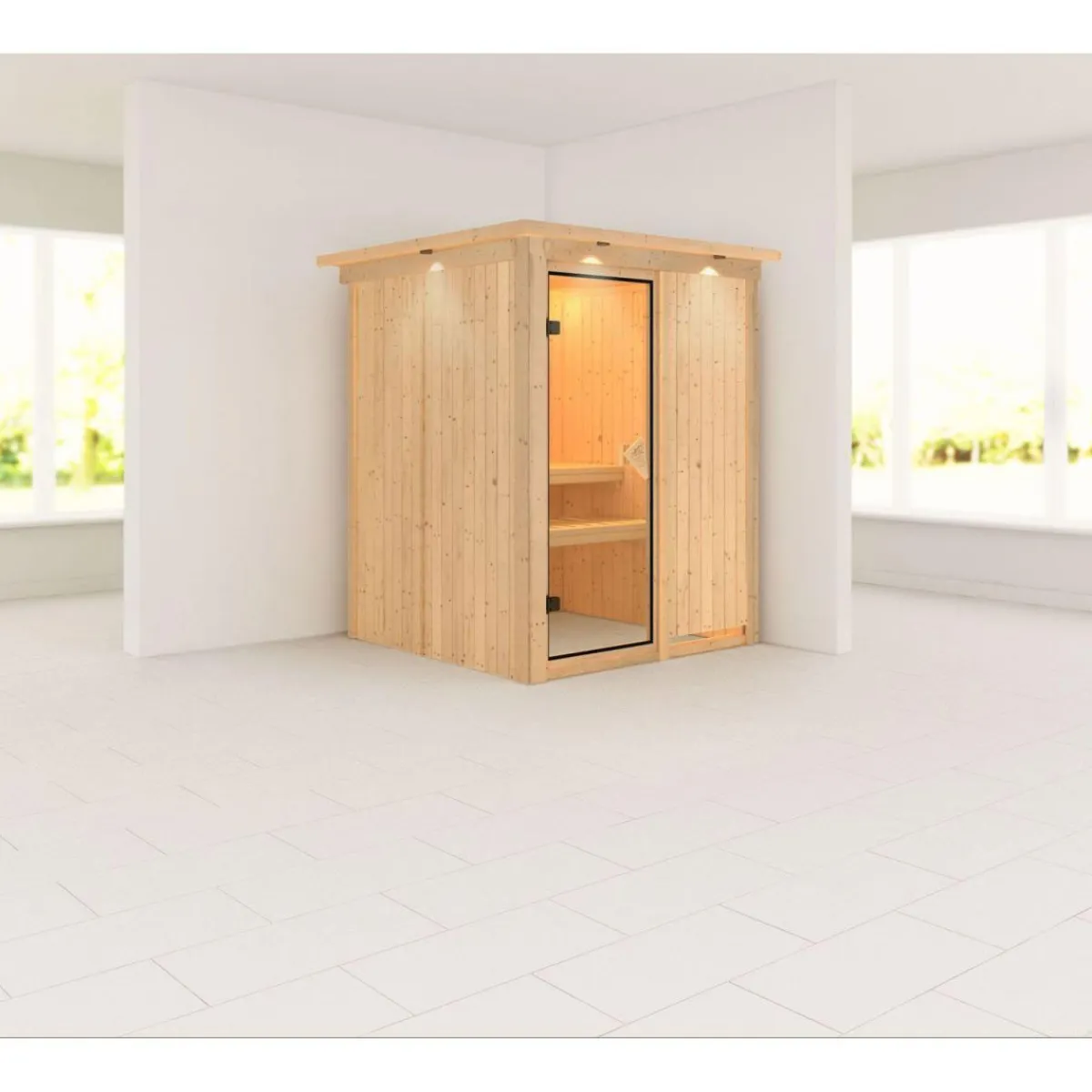 Entspannen Sie sich in Ihrer eigenen Plug & Play Sauna! Die Karibu Systemsauna Minja bietet Platz für bis zu 4 Personen und besteht aus hochwertiger nordischer Fichte. Der Fronteinstieg ermöglicht einen bequemen Zugang zur Sauna.