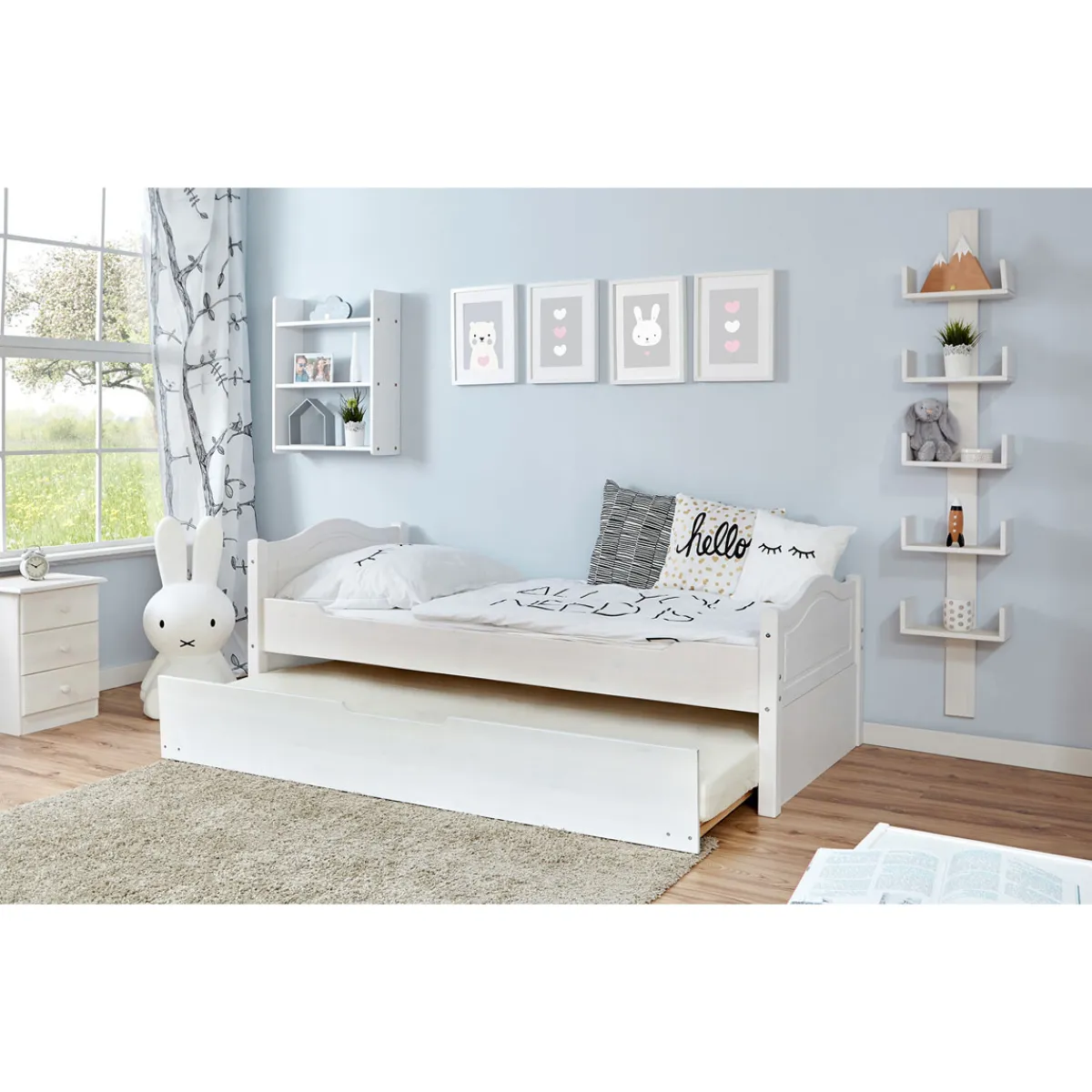 - Einzelbett Leni Kiefer weiß Var 1 – mit Zusatzbett (ohne Rollrost, Matratze und Dekoration)