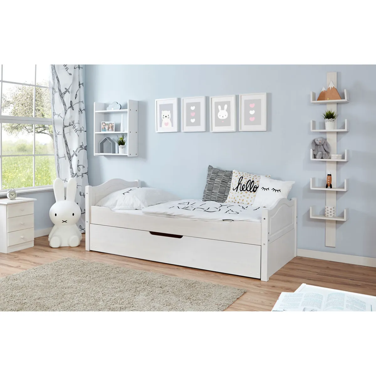- Einzelbett Leni Kiefer weiß Var 1 – mit Zusatzbett 90 x 200 (ohne Rollrost, Matratze und Dekoration)