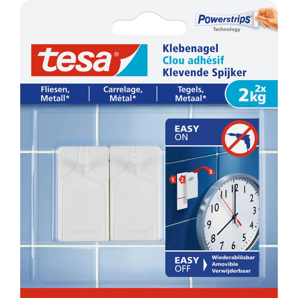 Mit dem Tesa Klebenagel für Fliesen können Sie problemlos Gegenstände mit einem Gewicht von bis zu 2 kg an Fliesen oder Metall befestigen. Der Nagel ist wiederverwendbar und lässt sich rückstandslos ablösen.