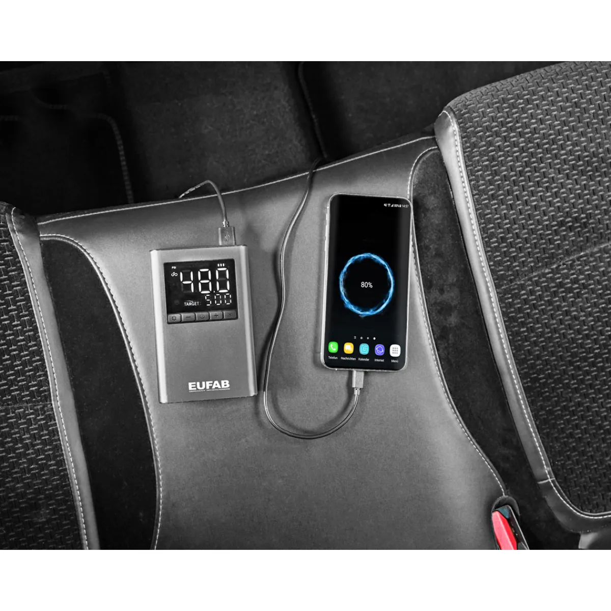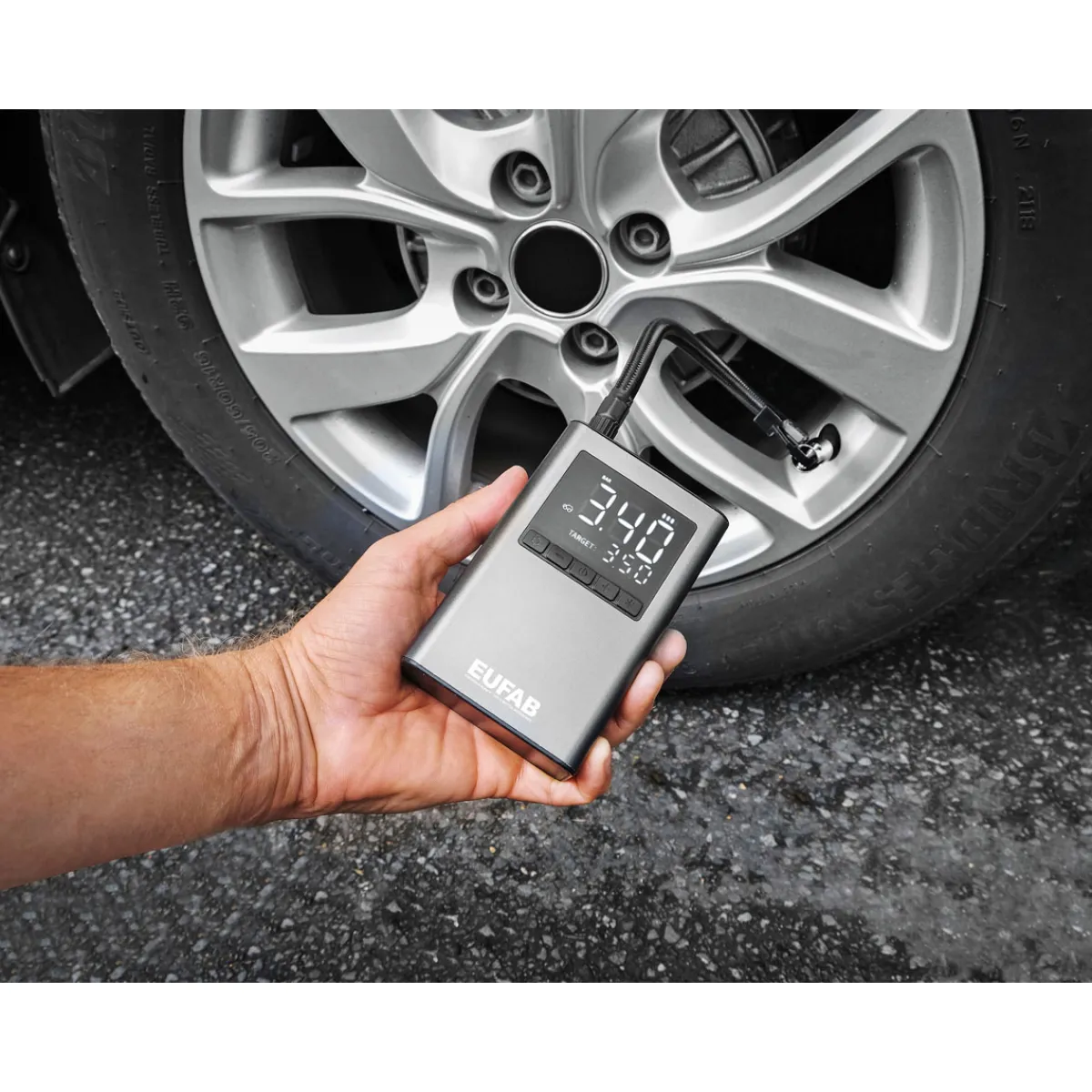 Anschluss 12 V, Stromaufnahme max. 6 A, Manometer bis 8 bar, inklusive verschiedene Adapter und Ladekabel.