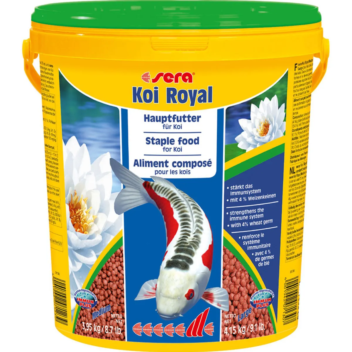 sera Koi Royal ist ein ausgewogenes Hauptfutter und perfekt auf die Ernährungsanforderungen von Koi und anderen Teichfischen abgestimmt. Es fördert gesundes Wachstum und ist hoch verdaulich. Der ausgewogene Gehalt an natürlichen Mineralien, Spurenelementen und Vitaminen stärkt die Abwehrkräfte und sorgt für vitale Fische. Entsprechend den Entwicklungsstufen der Koi ist das Futter in den drei Korngrößen Mini (2 mm), Medium (4 mm) und Large (6 mm) erhältlich. Alleinfuttermittel für Koi