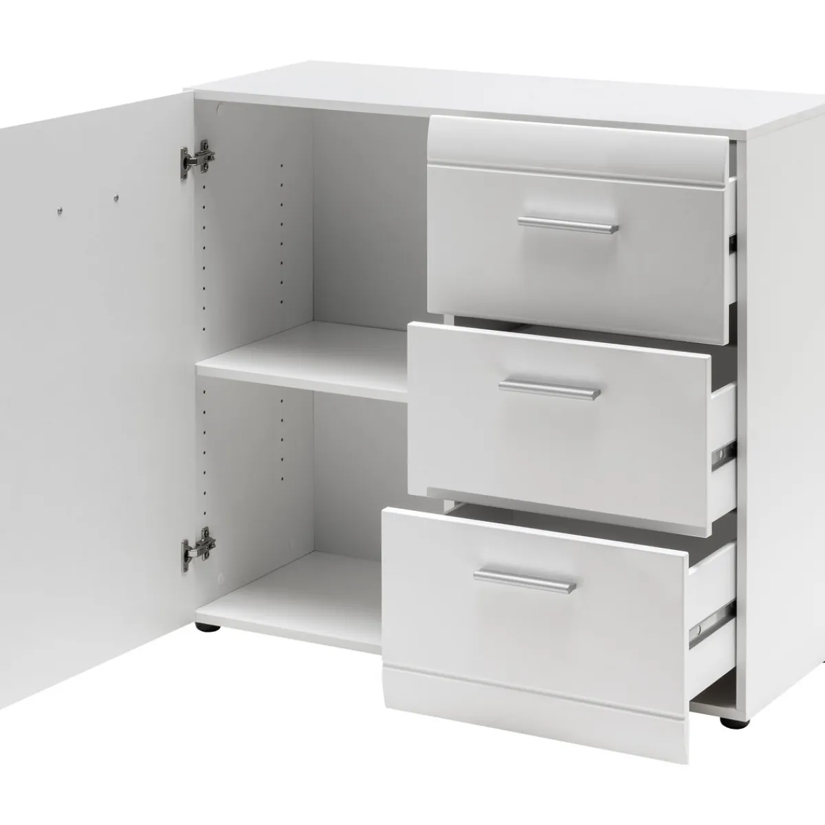 Sie suchen eine Kommode, die nicht nur praktisch ist, sondern auch Ihr Zuhause stilvoll aufwertet? Die Kommode Adison mit ihren weißen Fronten in Hochglanz und der eleganten Rillenfräsung ist ein echter Hingucker. Mit einer Breite von 96 cm, einer Höhe von 86 cm und einer Tiefe von 40 cm bietet sie großzügigen Stauraum für Ihre Lieblingsstücke. Das moderne Design fügt sich nahtlos in jede Einrichtung ein und sorgt für einen Hauch von Eleganz. Dank des verstellbaren Einlegebodens können Sie den Innenraum ganz nach Ihren Bedürfnissen gestalten – perfekt für Ordnungsliebhaber! Diese Kommode vereint hochwertige Materialien wie Spanplatte und MDF mit einem zeitlosen Look, sodass sie Ihnen lange Freude bereiten wird.