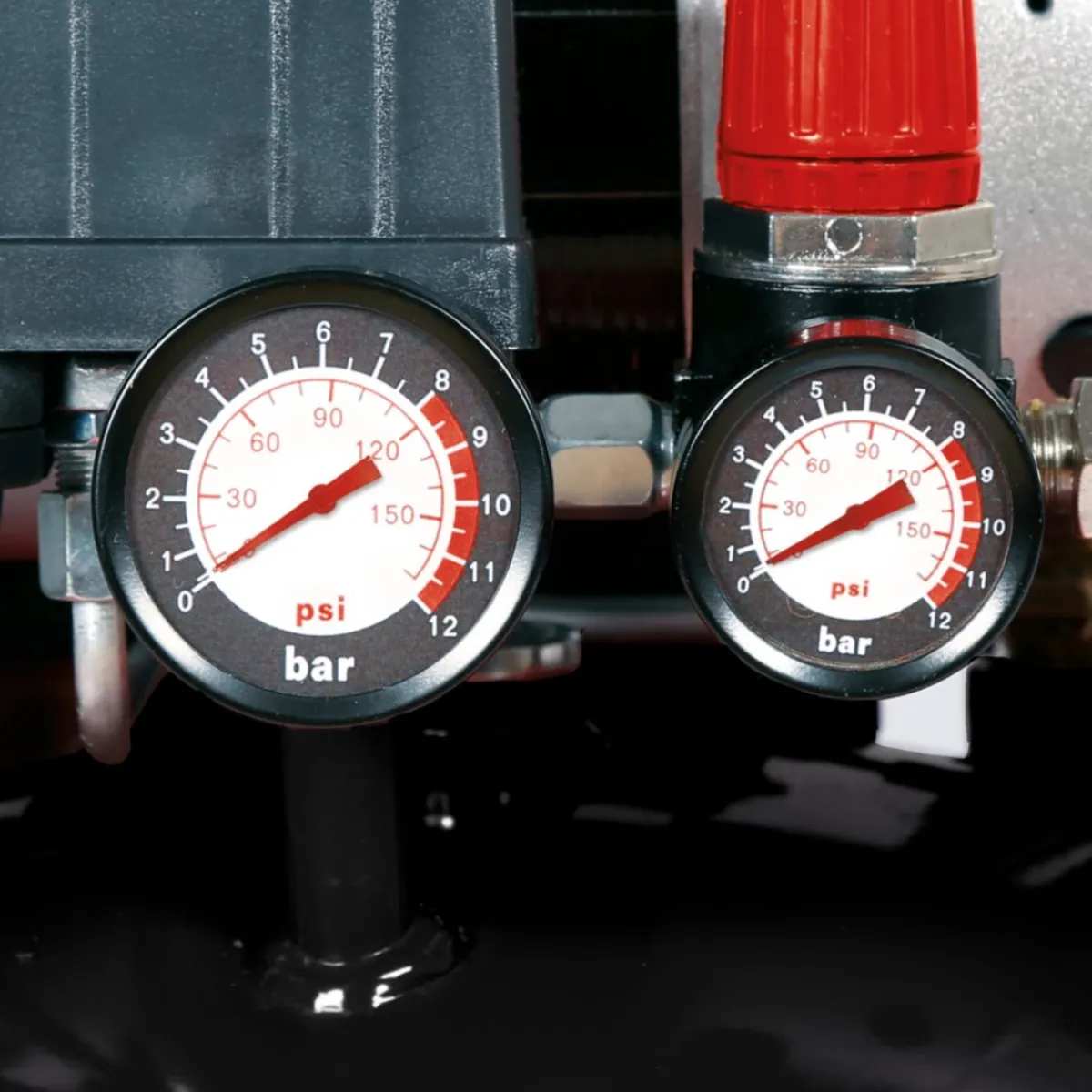 - Manometer und Schnellkupplung ermöglichen eine einfache Regulierung des Arbeitsdrucks bis zu maximalen Betriebsdruck von 8 bar