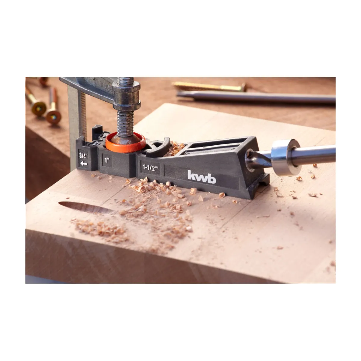 Mit der kwb Bohrschablone Taschenloch 5 teilig wird das präzise Arbeiten beim Holzverbinden zum Kinderspiel. Die Schablone enthält alles, was man für eine perfekte Verbindung benötigt.