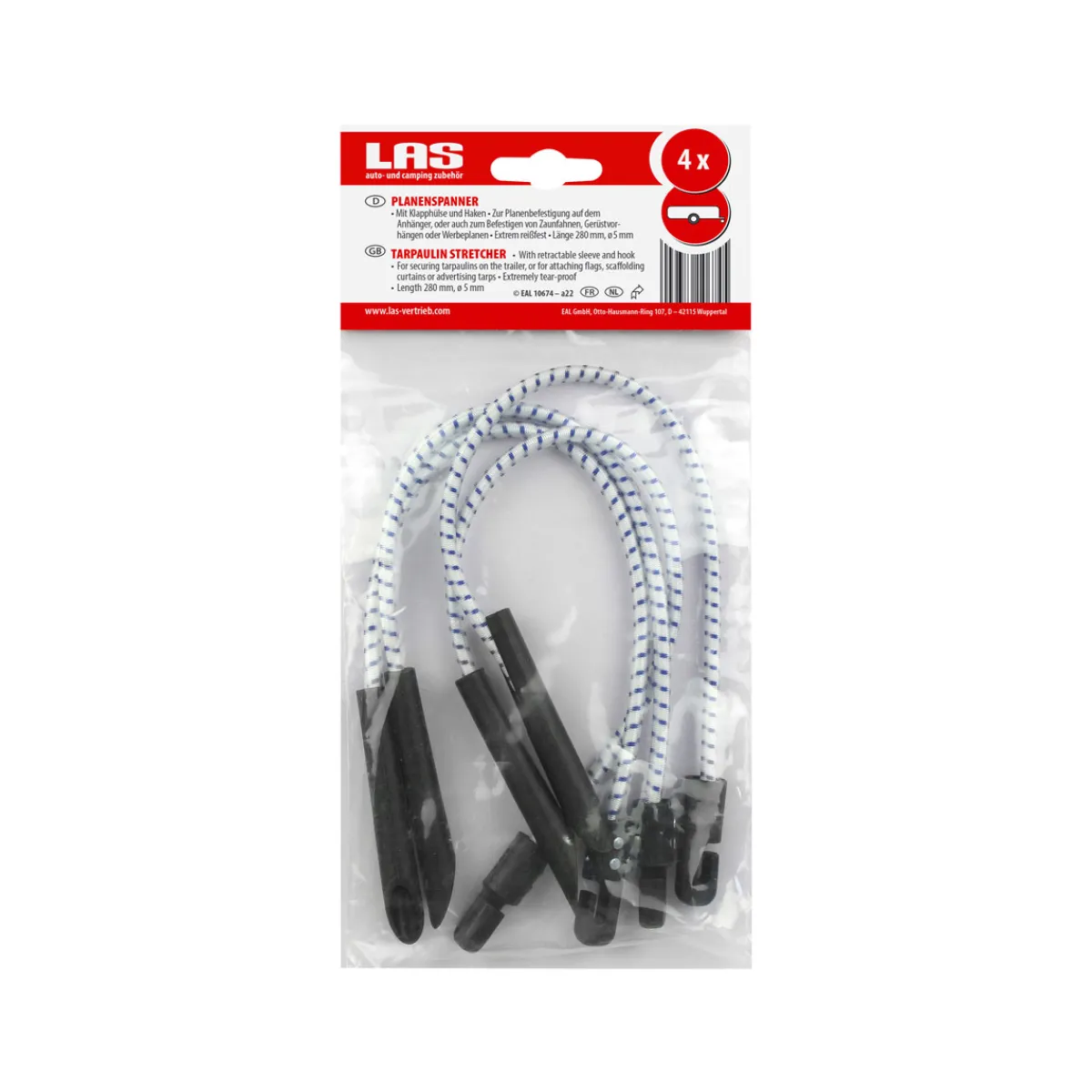 Mit den LAS 10674 Planenspannern mit Klapphülse wird das Befestigen von Planen und Abdeckungen zum Kinderspiel. Die hochelastischen Gummistränge sind extrem reißfest und dehnbar, sodass sie sich optimal an die Form des zu befestigenden Materials anpassen.