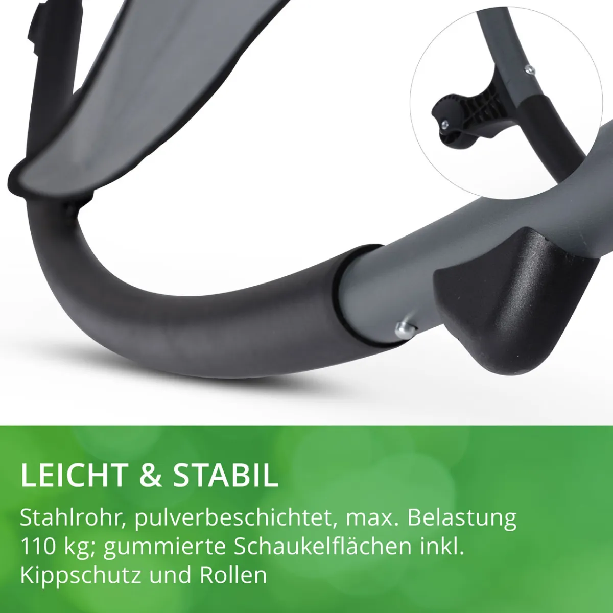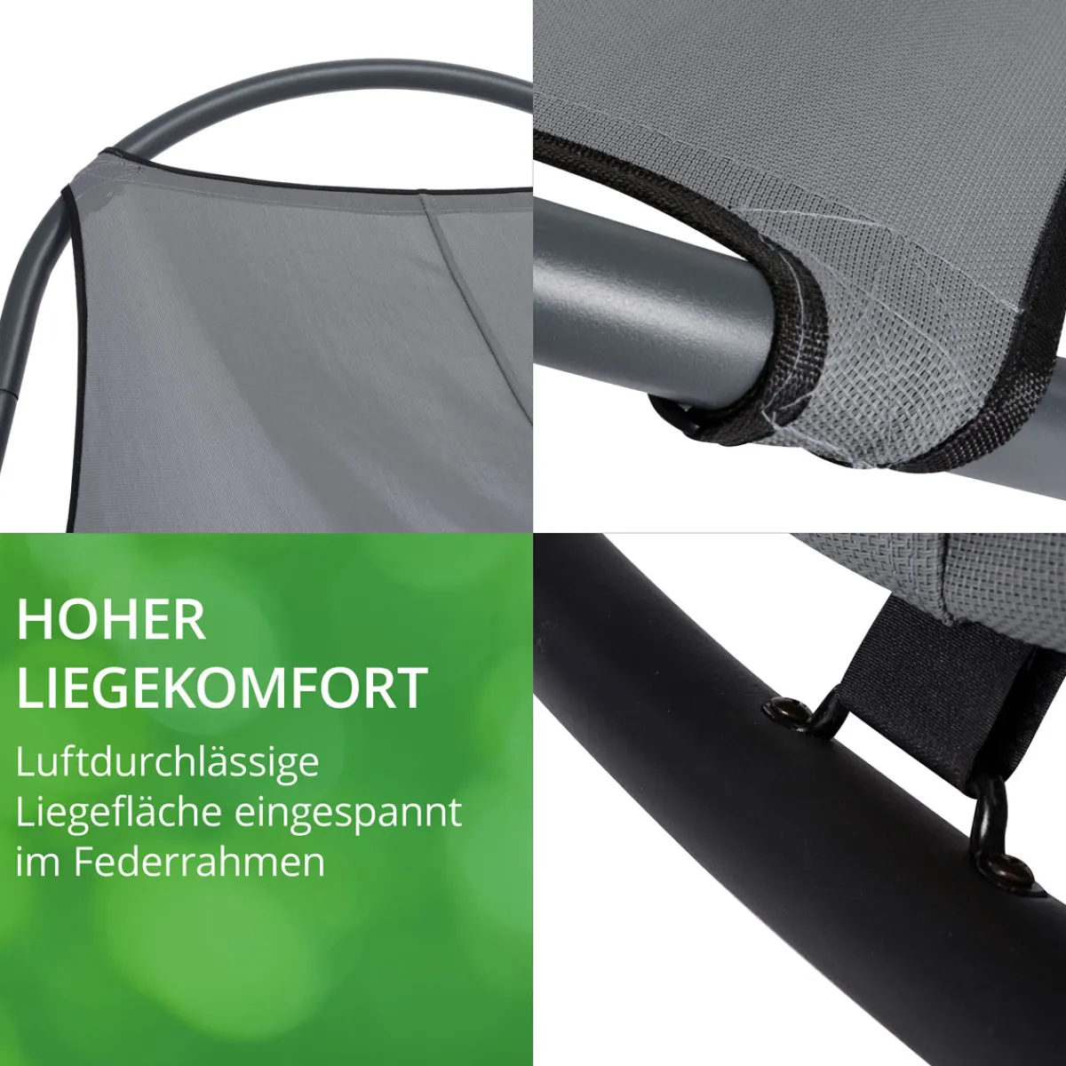 Genießen Sie den Komfort dieser trendigen Kombination aus Hängematte und Schaukel-Liege. Die eingehängte Liegefläche ist durch die Kunststoffgewebe-Bespannung im Federrahmen besonders bequem. Leichte Schaukelbewegungen des Rundrohrrahmens sorgen für maximale Entspannung. Die einfache, platzsparende Konstruktion und schnelle Montage machen die Outdoor-Liege zum flexiblen Begleiter – egal ob zuhause oder auf dem Campingplatz.