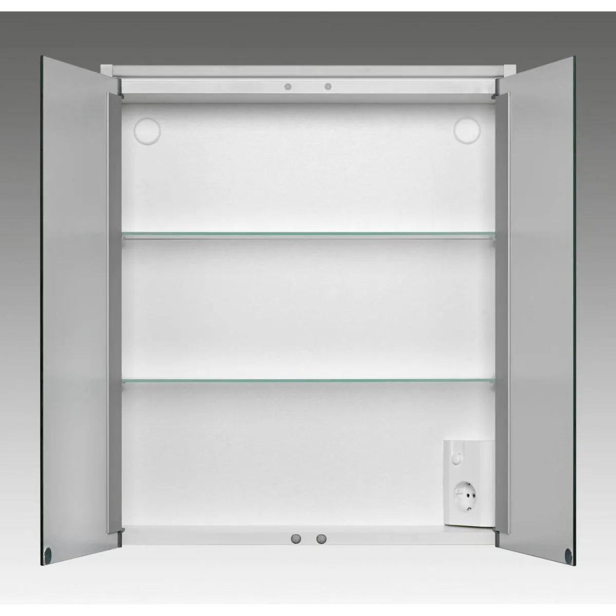 - – Ausstattung: 2 Kristallglasspiegeltüren, verstellbare Glaseinlagen, Mittelspiegel, Schukosteckdose und Schalter