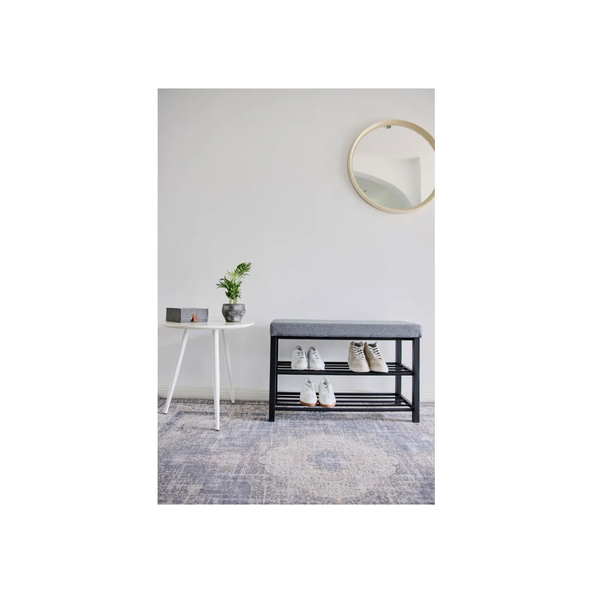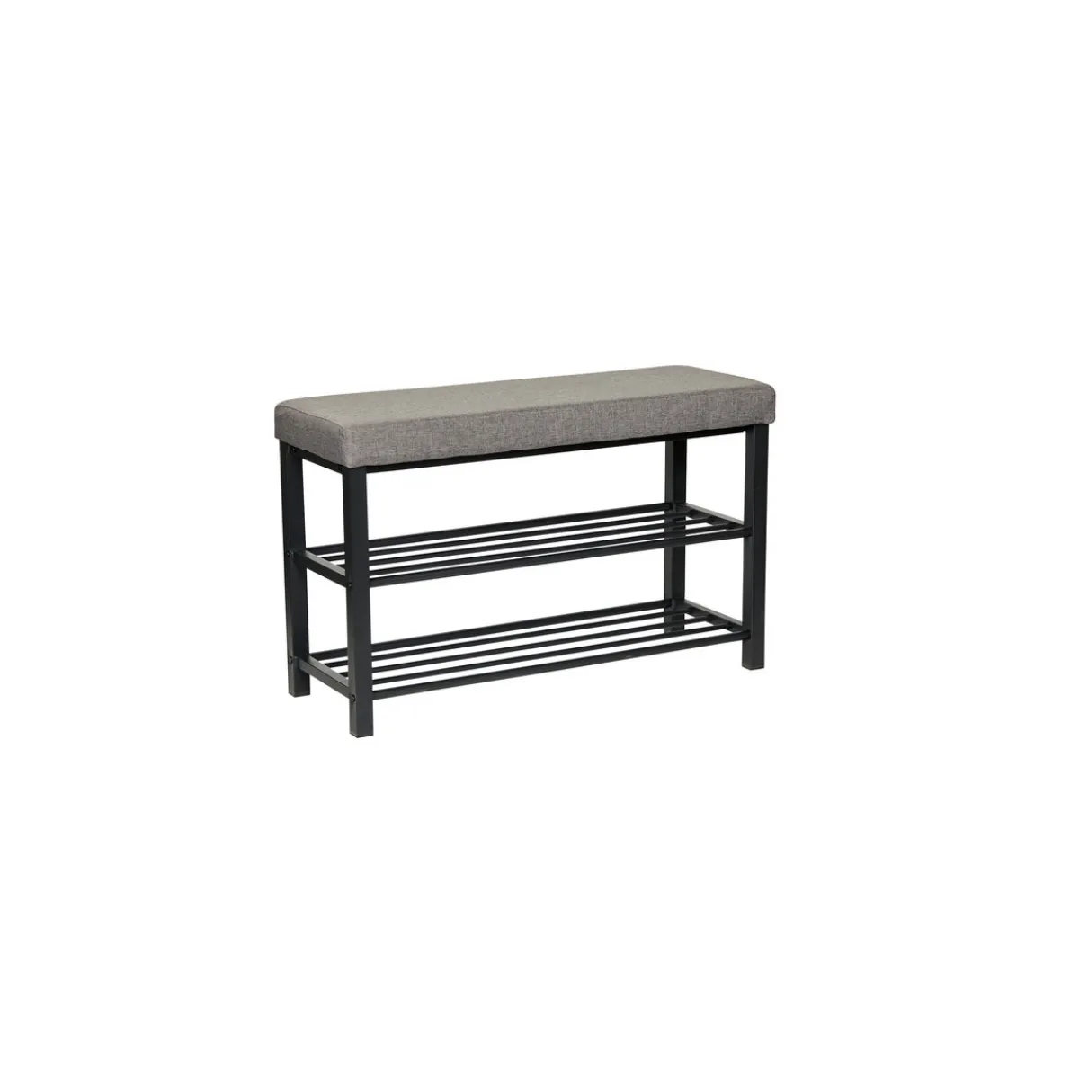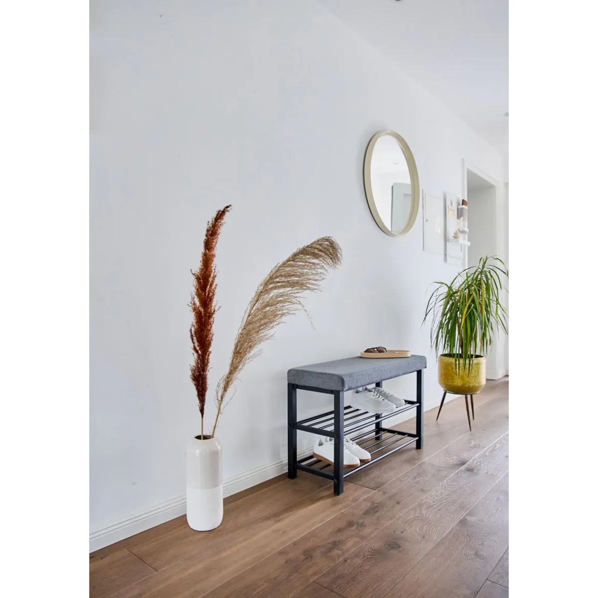 Das Schuhregal mit Sitzkissen bietet mit zwei Ablagefächern reichlich Platz für Sneaker, Sandalen und andere Schuhe. Nehmen Sie auf dem bequemen, gepolsterten Kissen Platz und lassen Sie sich einfach mal Zeit beim Schuhe anziehen. Schließlich ist der Alltag schon stressig genug. Der elegante Leinenstoff macht die Schuhbank zu einem Blickfang in Ihrem Flur. Durch das schlichte Design passt sich das Schuhregal perfekt in alle Wohnräumen ein und nimmt dabei mit den Maßen 80 x 50 x 31 cm wenig Platz in Anspruch. Das Sitzkissen ist gut gepolstert, sodass man sich bequem setzen kann. Das Metall-Gestell der Schuhbank sorgt für Stabilität.