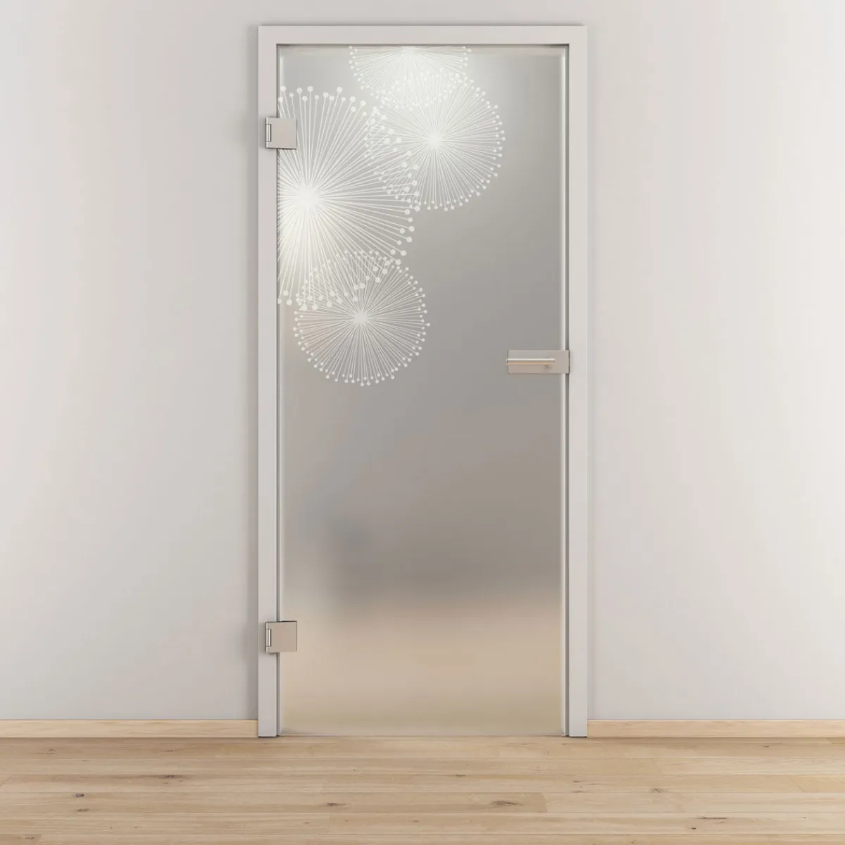 - Modernes graphisches Muster auf mattem Glas für eine stilvolle und zeitgemäße Raumgestaltung