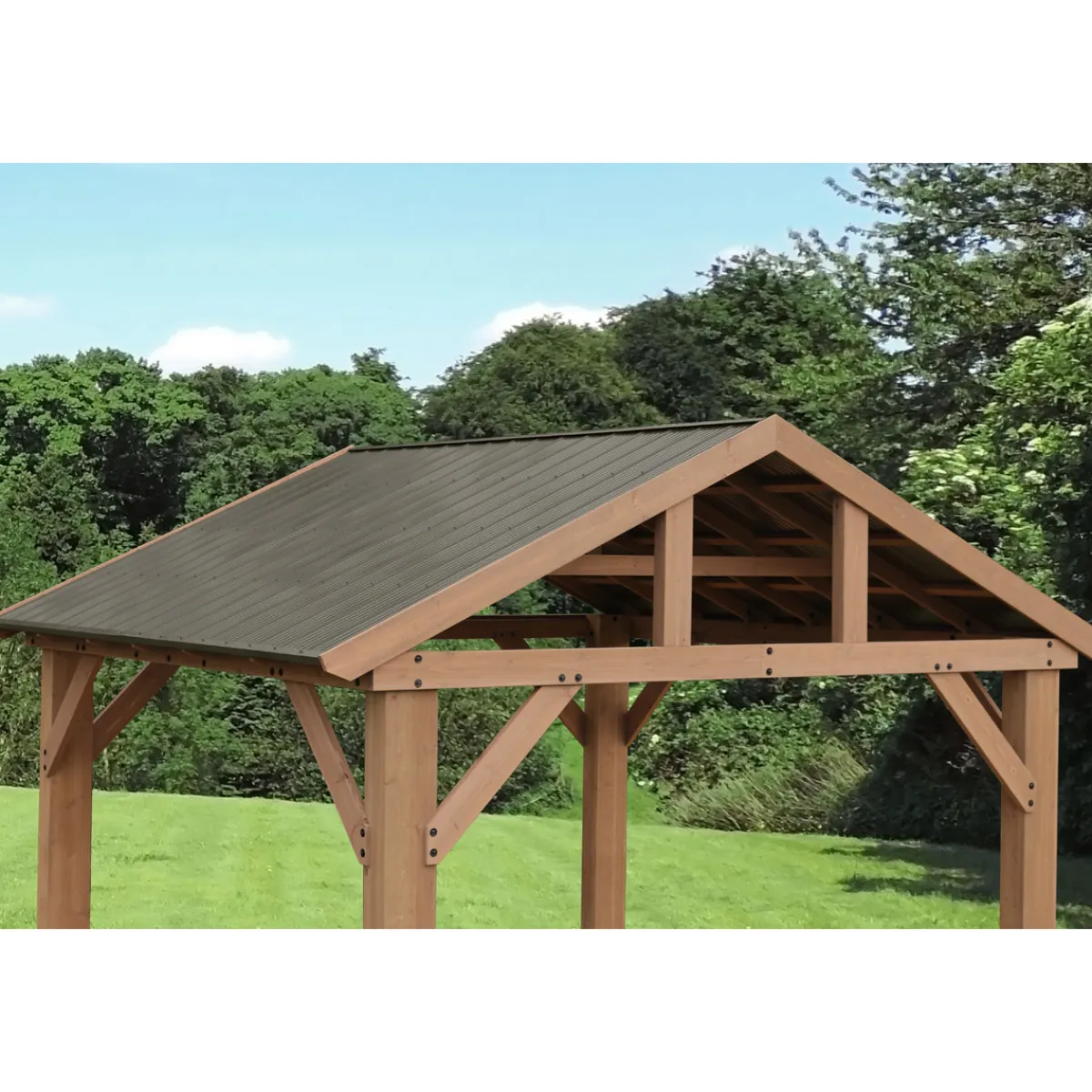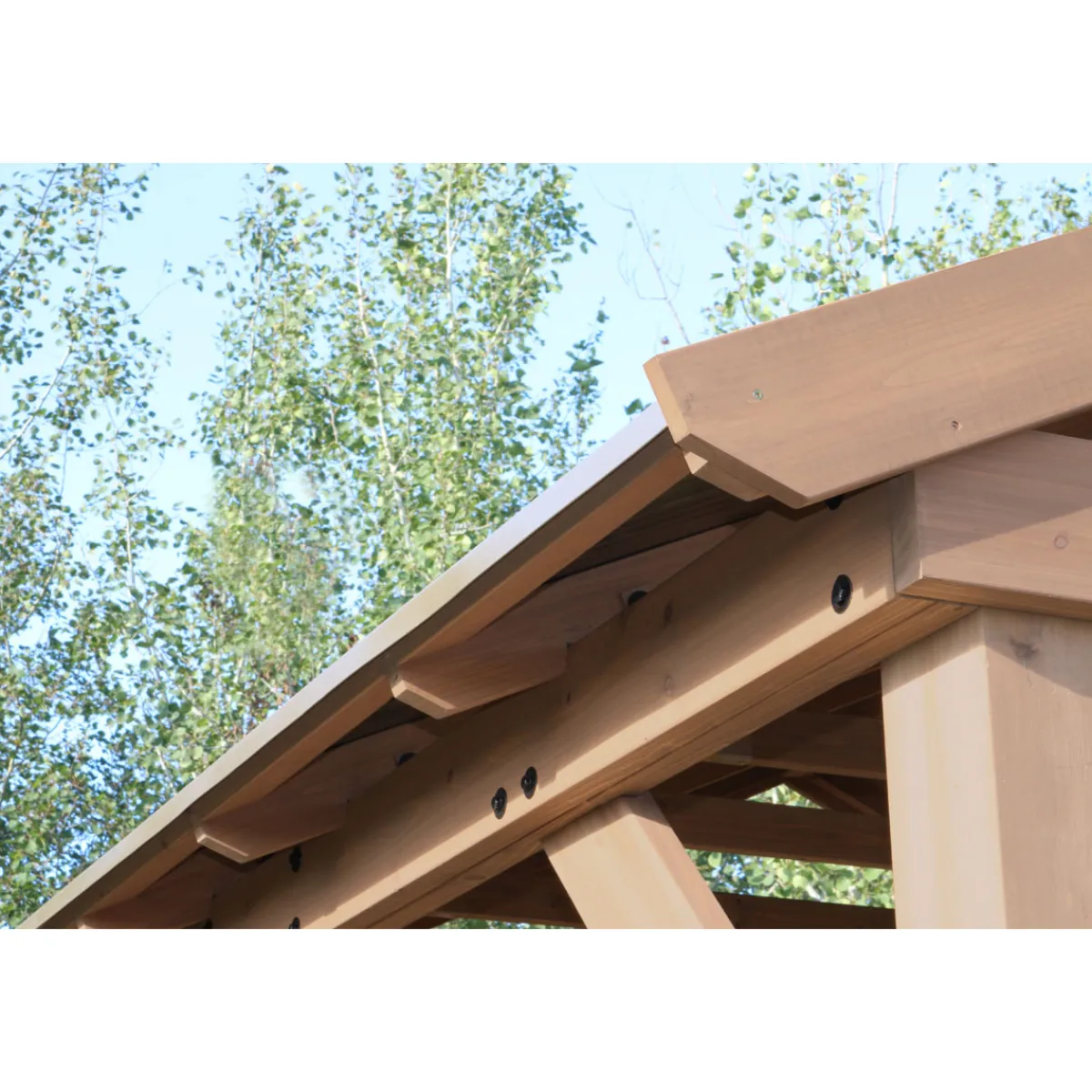 Der perfekte Pavillon für Ihren Garten – Modern, stabil und langlebig! Ob als zusätzliche Sitzgelegenheit, als Rückzugsort zum Entspannen, als Unterstand oder zum Feiern und Grillen mit Freunden — ein Pavillon aus Holz ist eine stabile und optisch ansprechende Möglichkeit, nicht nur seinen Außenbereich durch weiteren multifunktionalen Lebensraum zu erweitern, sondern gleichzeitig auch den Garten zu verschönern. Pavillons eignen sich auch ideal als kostengünstige und robuste Alternative zu klassischen Kaltwintergärten. Der Westmann Pavillon ist ein Holzpavillon mit Bronze-Aluminium-Dach. Der Gartenpavillon ist hergestellt aus Cedar-Holz. Das Holz ist mit einer natürlichen Zedernholzbeize vorbehandelt, die jeden Raum eine warme und unverwechselbare Note verleiht. Dadurch punktet er nicht nur in Sachen Nachhaltigkeit, sondern fügt sich dank der naturbelassenen Beize in Mokkabraun auch ganz natürlich und dezent in sein Umfeld ein. Gleichzeitig sorgt die natürliche Farbe für eine gewisse Wärme und verleiht dem Pavillon so ein Gefühl von Heimeligkeit und Gemütlichkeit. Die stabilen Pfosten sorgen für Standfestigkeit. Alle Teile des Pavillons sind bereits vorgeschnitten und vorgebohrt. So wird ein einfacher Aufbau ermöglicht. Zusätzlich lässt sich der Pavillon durch separat erhältliche Moskitonetze aus robustem Gewebe, eine Sichtschutzwand oder einen Bartresen ganz nach Ihren Wünschen und Ansprüchen zusätzlich erweitern und individualisieren. Besonderheiten: * Zedernholz * Multifunktional, robust & nachhaltig * Ideal für jeden Außenbereich * Aluminium-Dach * Stabile Pfosten * Vorgeschnittene & vorgebohrte Teile für einfachen Aufbau * Braune Beize sorgt für Wärme & Gemütlichkeit