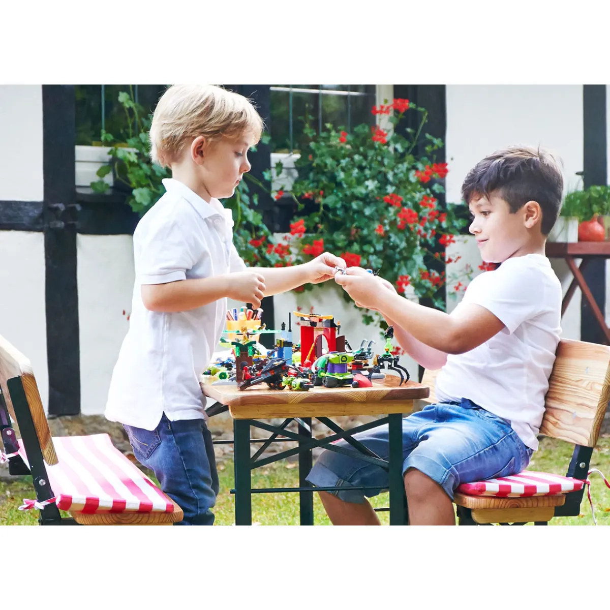 Klassiker in Kindergröße: die Festzeltgarnitur lässt sich kinderleicht zusammenklappen und platzsparend verstauen. Eine spontane Brotzeit im Garten? ‚Sepp mit Lehne‘ lässt sich schnell und einfach aufbauen, sodass der Tisch sofort gedeckt werden kann von 3 bis 8 Jahren