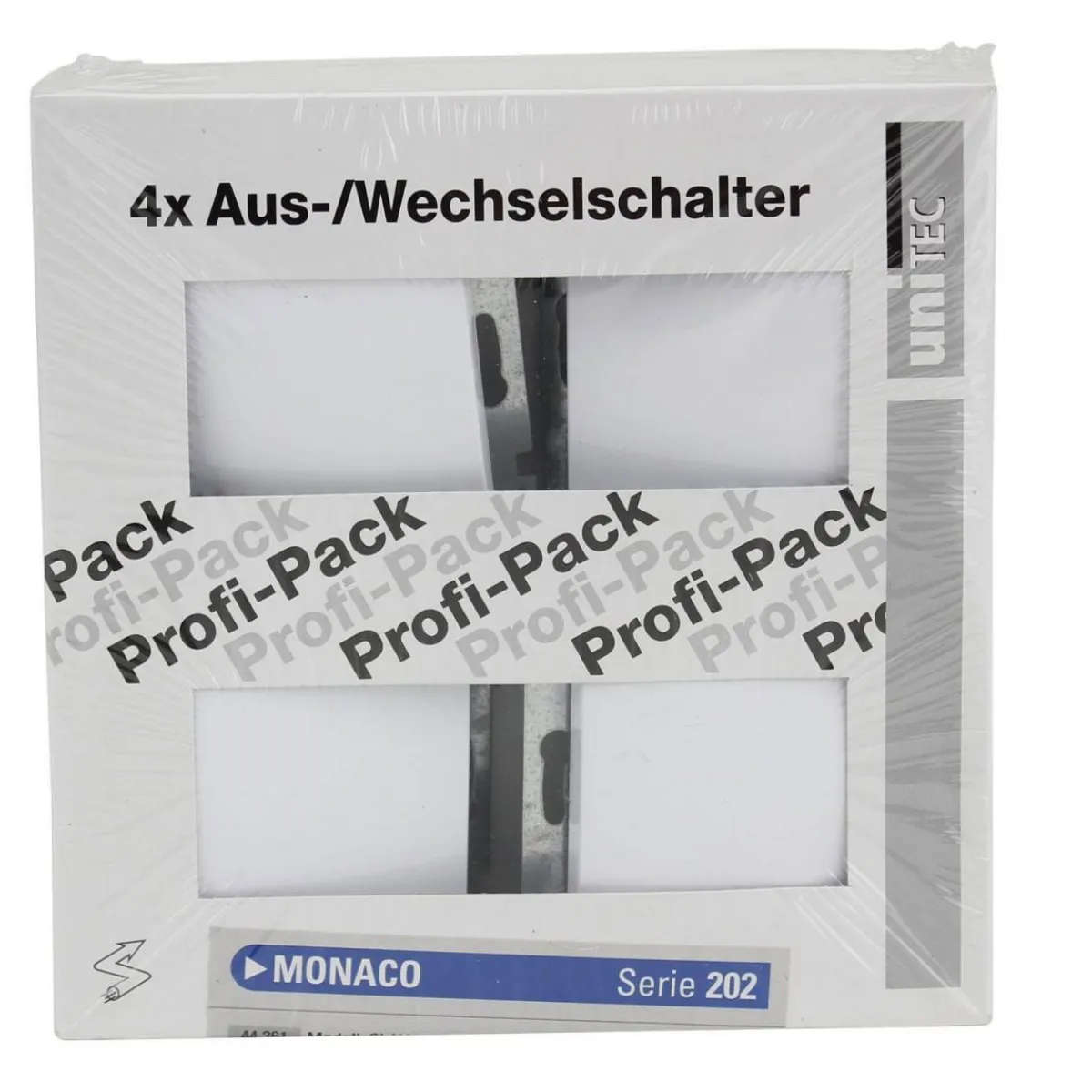 Produktdetails des PROFI-PACK-SETS Aus-/Wechselschalter Monaco ultraweiß 4 Stück Serie 202