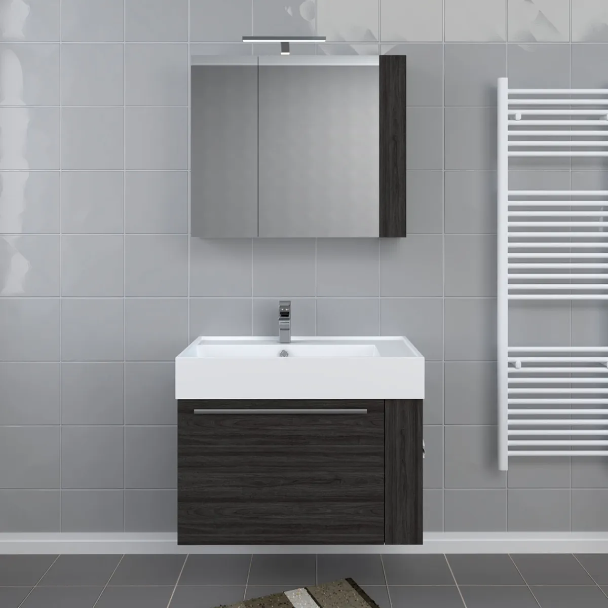 Mit diesem Set erhalten Sie nicht nur hochwertige Möbel, sondern auch ein stilvolles Ambiente im Badezimmer. Die Kombination aus grauer Grundfarbe und Holz-Optik verleiht dem Set eine moderne Note, während der Spiegelschrank mit Beleuchtung und Soft-Close-Funktion den Komfort erhöht. Bestellen Sie jetzt das Progetto Idea Stella Badmöbel-Set DOMUS 80 in Ulme Onyx bei !