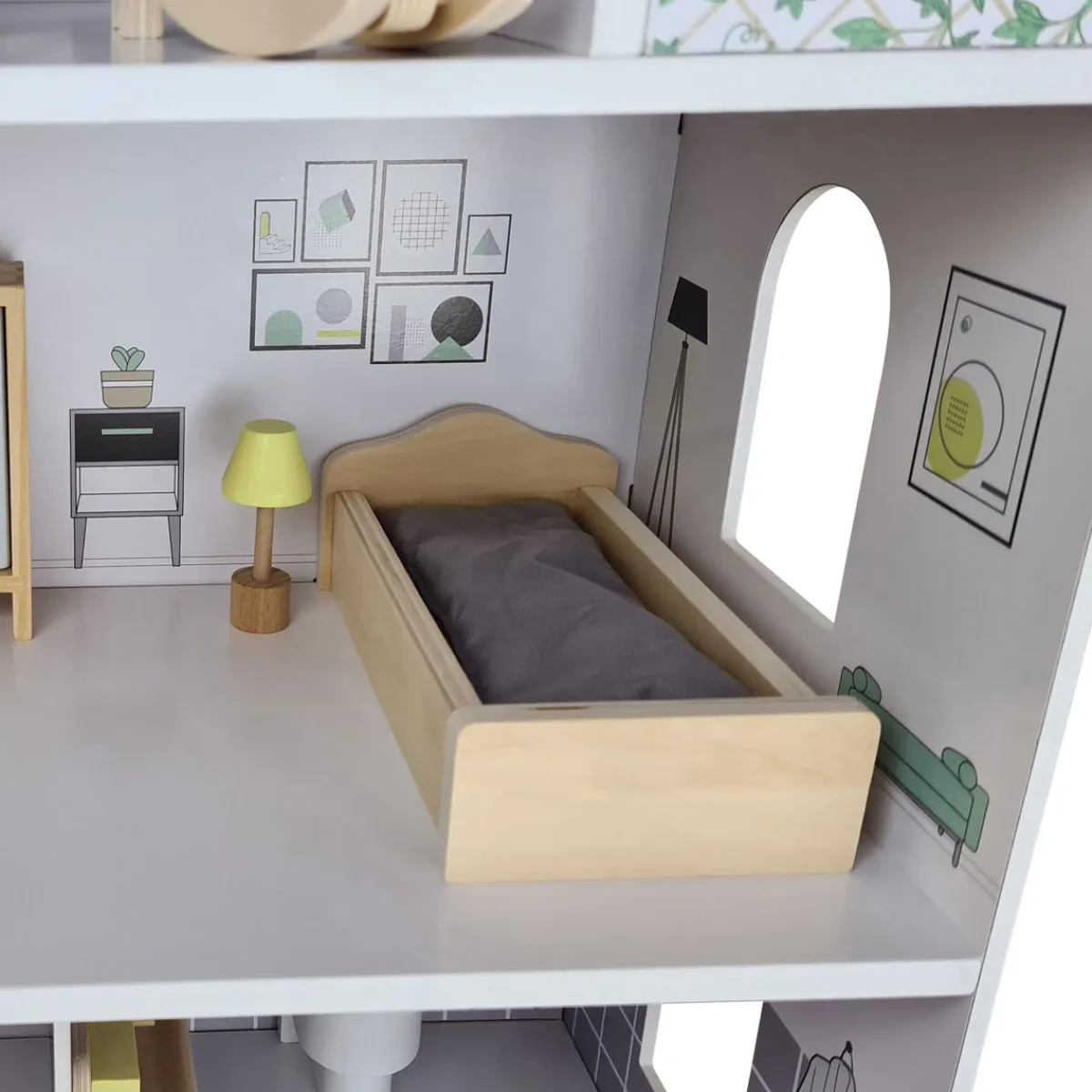| Ausstattung: | Wohnzimmer (Schrank, Tisch, Stühle) Schlaf- Kinderzimmer (Bett, Lampe, Schaukelpferd) Badezimmer (Toilette) Küche (Herd mit Dunstabzugshaube, Spülbecken) stabile Ständerkonstruktion mit großen Spielöffnungen, Material MDF Aufbauanleit |