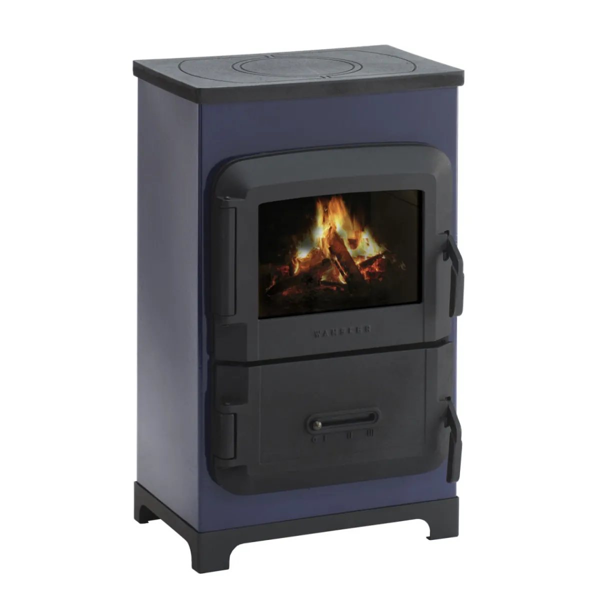 Besonders hervorzuheben ist außerdem die Verkleidung mit Emaille, die nicht nur für den speziellen Glanz und einen charmanten Vintage-Touch sorgt, sondern den Ofen auch widerstandsfähiger macht. Der Anschluss für das Abzugsrohr befindet sich hinten. Mit den Maßen von 44,1x75x33,6 cm (BxHxT) ist dieser Ofen so konzipiert, dass er in den meisten Räumen unkompliziert einen Standort finden sollte.