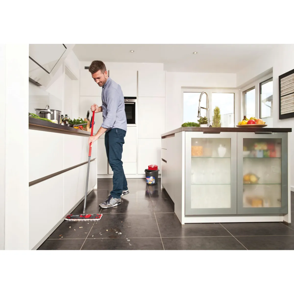 Mit dem Vileda Reinigungssystem Ultramat wird die Bodenreinigung zum Kinderspiel. Die kraftvollen 3-D Fasern entfernen selbst hartnäckige Verschmutzungen und hinterlassen einen glänzenden, streifenfreien Boden.