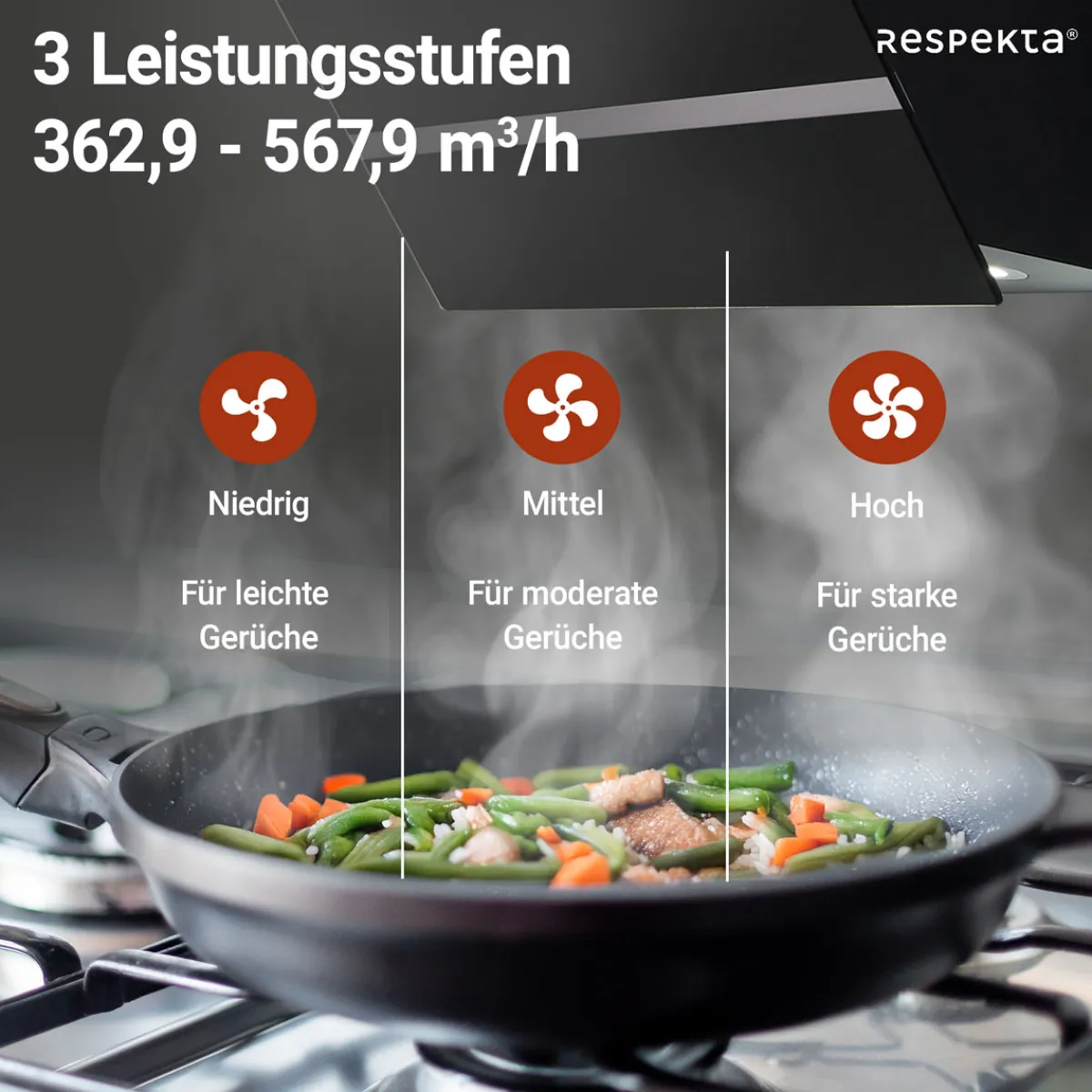 Die Respekta Design-Schräghaube Hera CH24060SAM in Schwarz vereint modernes Design mit hoher Funktionalität und Effizienz. Mit einer maximalen Luftleistung von bis zu 525 m³/h sorgt sie für eine schnelle Beseitigung unangenehmer Gerüche beim Kochen. Die drei verschiedenen Geschwindigkeitsstufen ermöglichen eine individuelle Anpassung an den Bedarf des Nutzers. Dank der Touch-Control Steuerung lässt sich die Schräghaube einfach bedienen und reinigen.