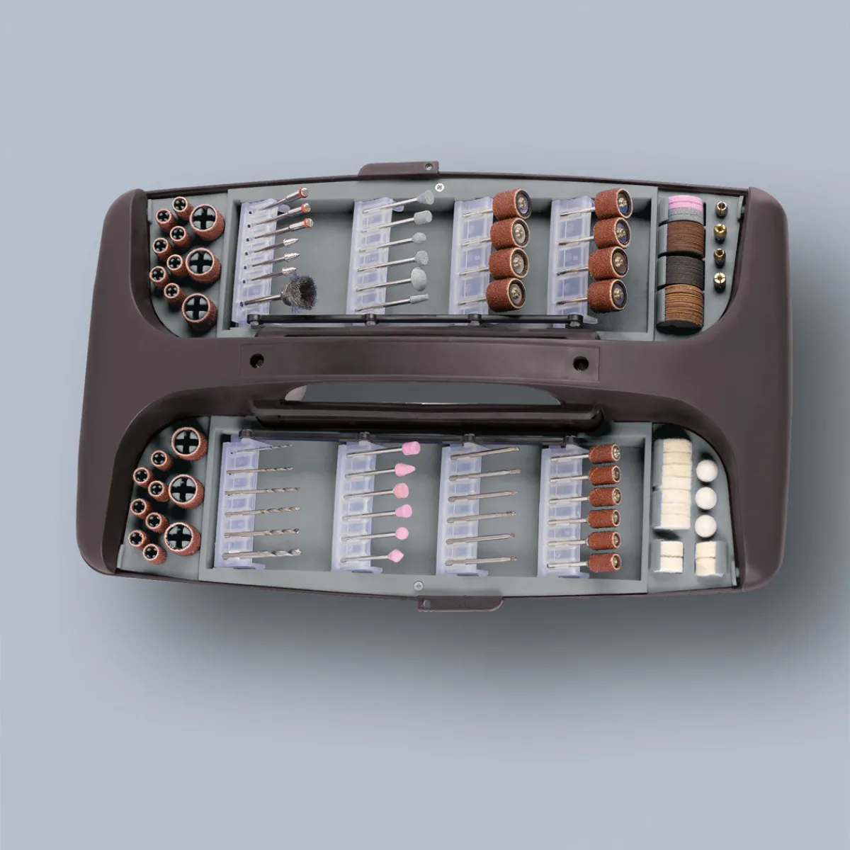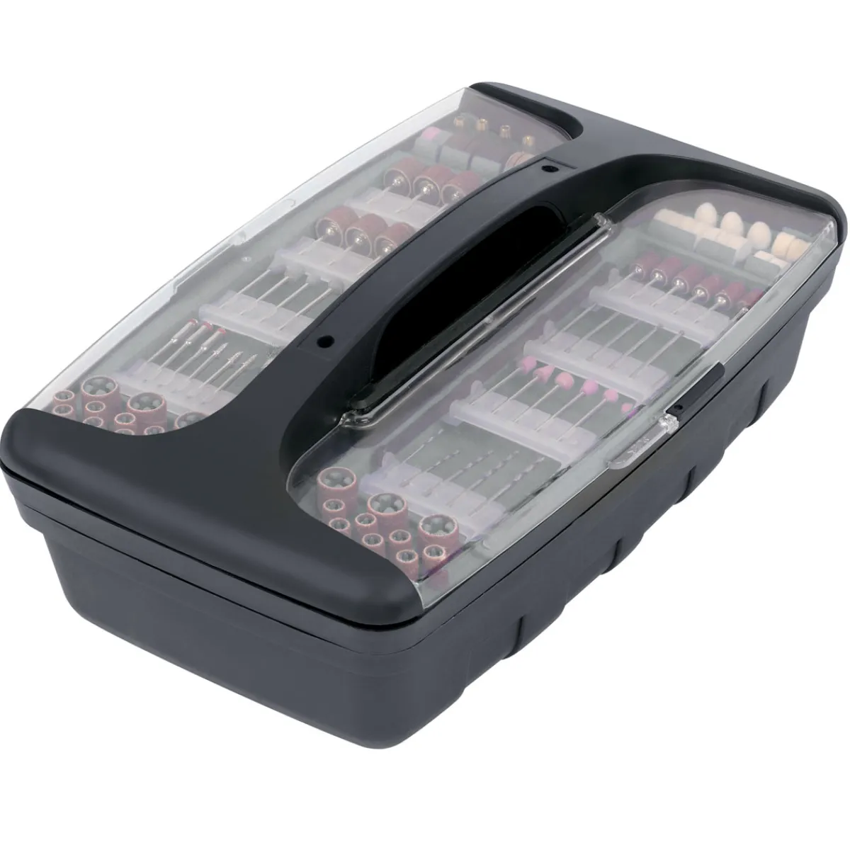 - – Lieferumfang: Multischleifer, Schleif- und Gravur-Set, Transport und Aufbewahrungskoffer, Flexible Welle 1 m, Teleskopstativ, 12 Schleifstifte aus Edelkorund, 6 Frässtifte, 22 Schleifwalzen, 34 Aufsätze für Schleifwalze, 3 Aufnahmen für Miniatur-Schleif- & Trennscheiben