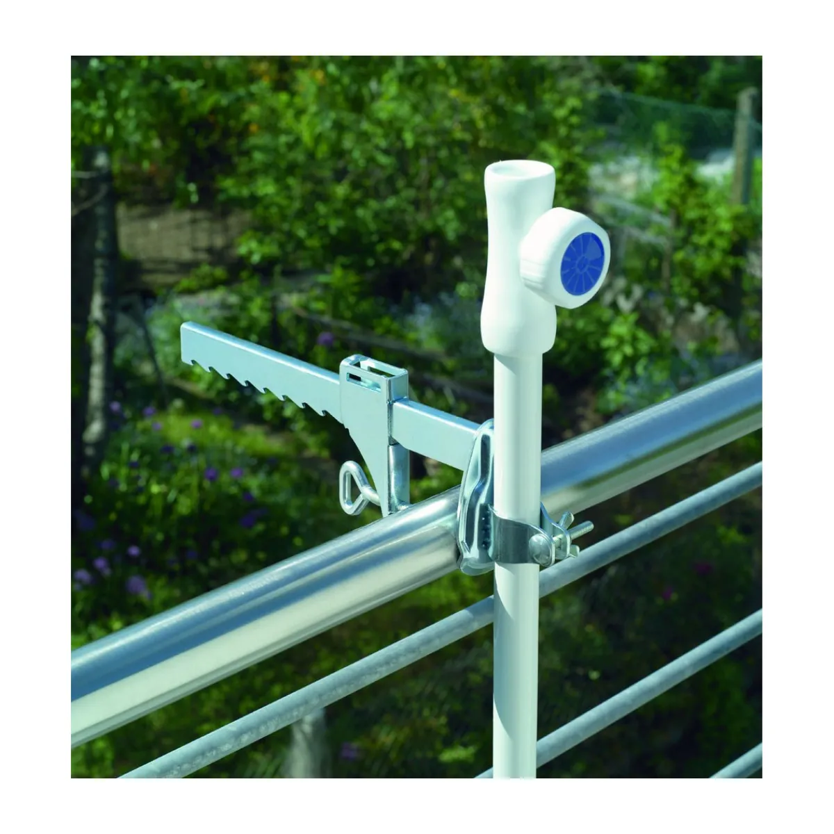 Genießen Sie die Sonne auf Ihrem Balkon mit der platzsparenden Schneider Schirme Balkonklammer für Gartenschirme.