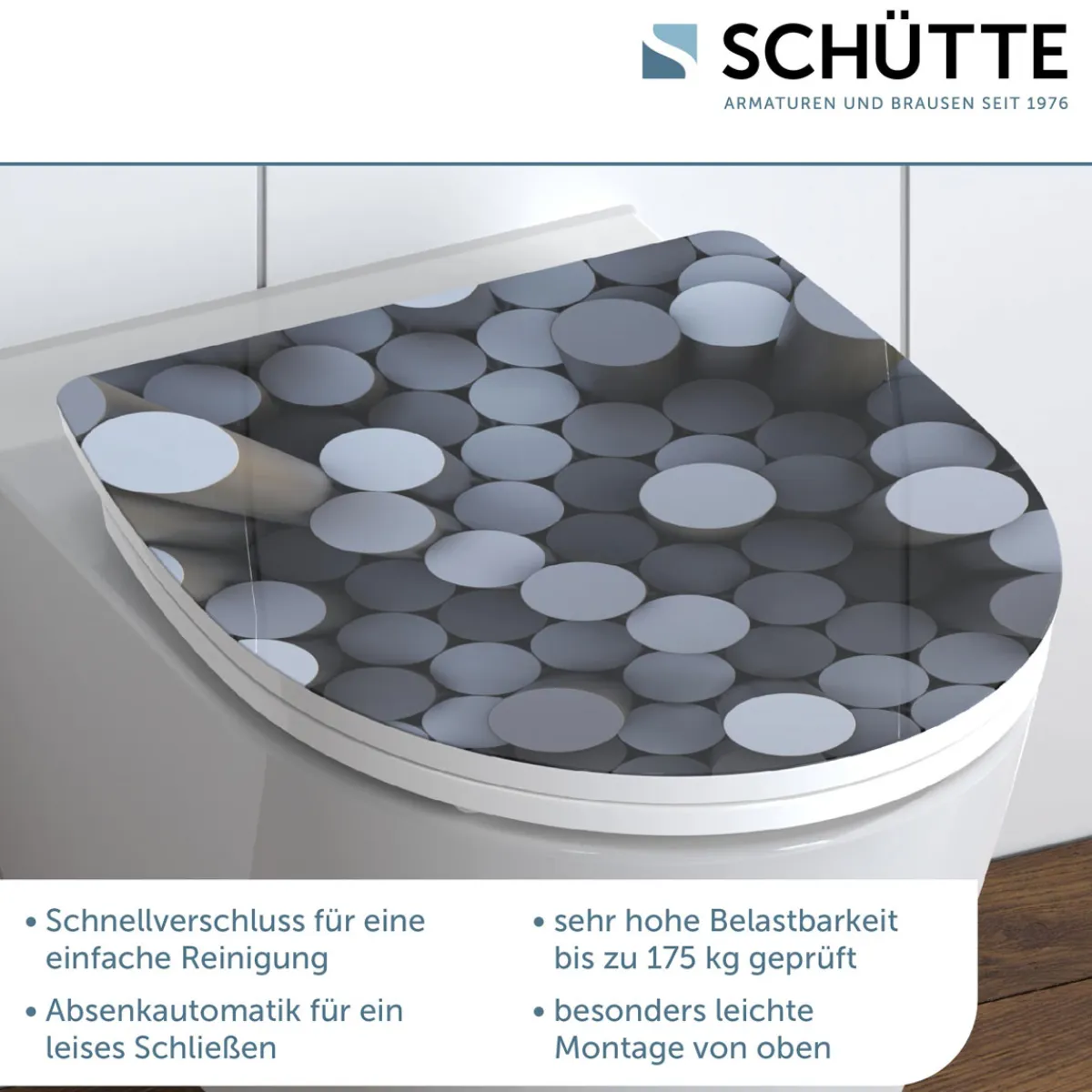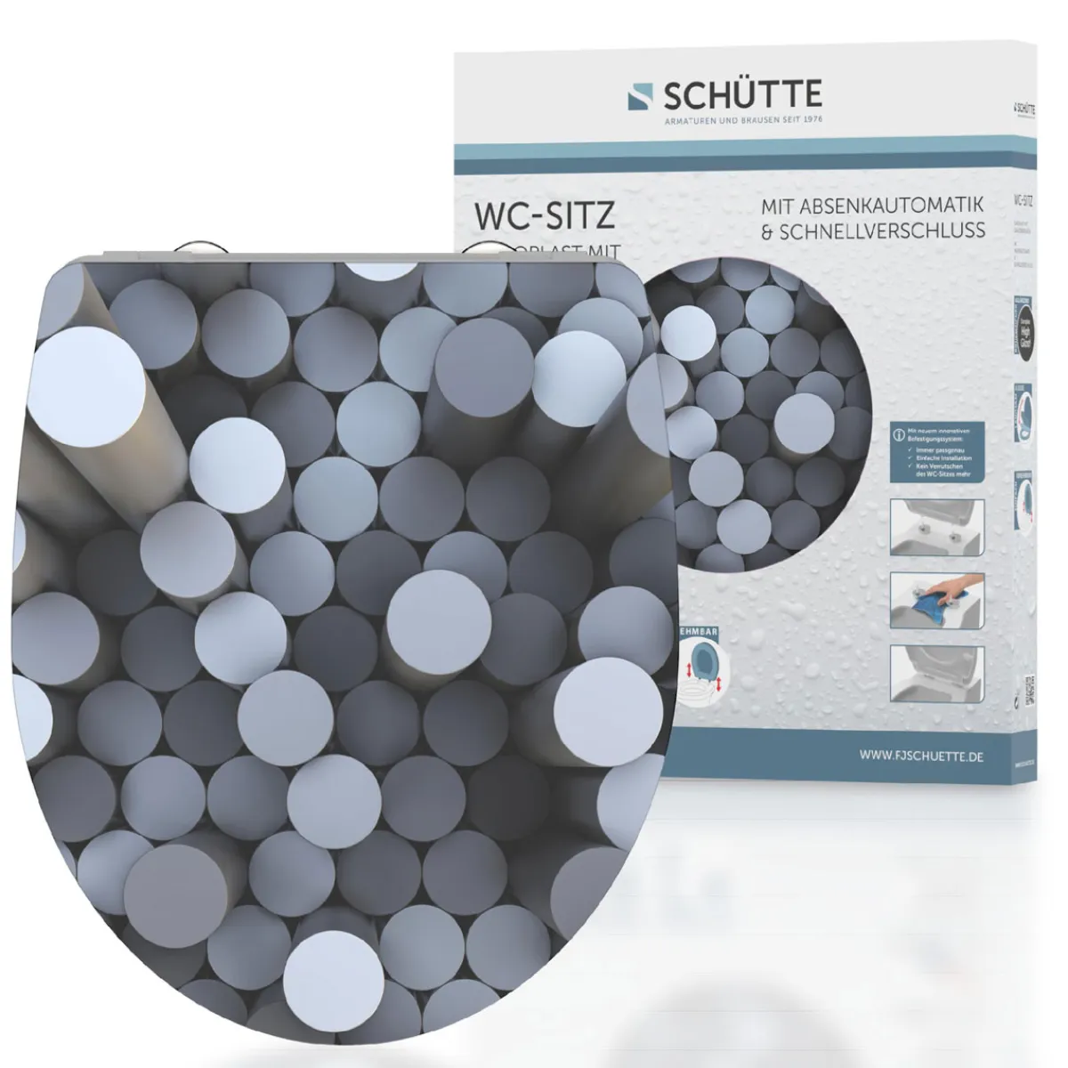 Erleben Sie den Komfort des Schütte Schütte Duroplast HG WC-Sitzes ROUND DIPS mit Absenkautomatik und Schnellverschluss. Dieser WC-Sitz bietet Ihnen nicht nur eine einfache Montage, sondern auch ein stilvolles Design.