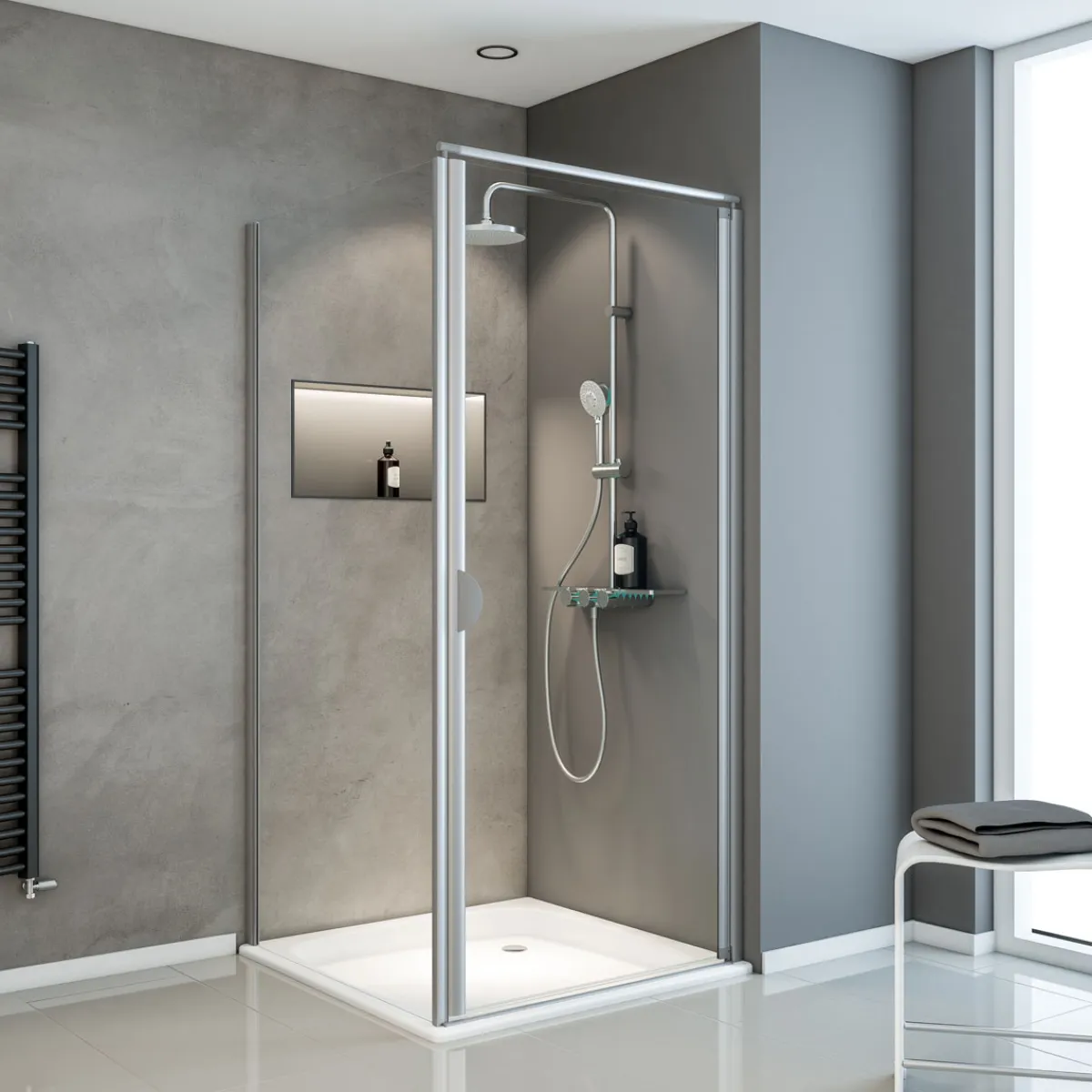 | Lieferumfang: | Drehtür, Seitenwand, Duschwanne, Stabilisationsbügel |