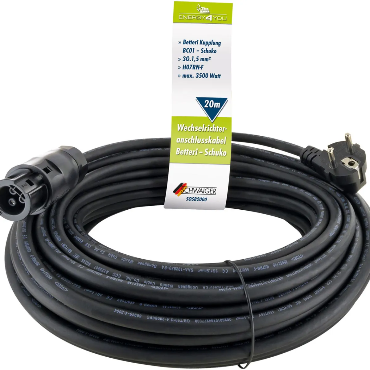 - Lieferumfang umfasst ein komplettes Betteri-auf-Schuko-Stecker-Kabel mit einer Länge von 20 Metern.